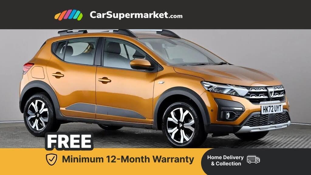 3.5" TFT instrument panel with on-board computer,Blind spot warning,Cruise control with speed limiter,eCall emergency call system,Eco mode,Electric power assisted steering,Front parking sensors,Rear parking sensors,Rev counter,Reversing camera,Stop/start system,8" MediaNav - DAB Radio, Wifi smartphone replication, Bluetooth, 6 speakres, Apple CarPlay and Android Auto,USB connection for data transfer and charging,USB socket,3 speed windscreen wipers,Auto lighting,Automatic wipers,Body colour door handles,Body colour door mirrors,Body coloured bumpers,Chrome longitudinal roof bars,Chrome radiator grille,Electrically adjustable and heated door mirrors,Front fog lights,Heated rear window,High level third brake light,LED automatic daytime running lights,LED Y-shape Dacia signature lighting,Modular roof bars,One touch electric front windows,Rear electric windows,Rear side wing doors,Rear wash/wipe,Stepway inscription on radiator grille and roof bars,Tinted windows,1/3 to 2/3 split folding rear seats,12 volt front socket,12 volt rear socket,3 height adjustable rear headrests,3 seat rear bench,Automatic air conditioning,Driver + passenger vanity mirrors,Fabric upholstery,Fixed smartphone holder on dashboard,Gear shift indicator,Height adjustable driver seat,Height adjustable front headrests,Height/depth adjustable steering wheel,High central armrest with console storage,Isofix points for child seats in both outer rear seats,Satin chrome interior door handles,Satin Chrome/Copper orange air vents,Single front passenger seat,Soft feel steering wheel,Steering wheel controls,3x3 point rear seatbelts,ABS and Emergency brake assist,Automatic emergency braking system,Child locks on rear doors,Door open warning,Driver airbag,Electronic parking brake,ESC (Electronic Stability Control),ESP + Hill Start Assist,Front curtain airbags,Front seatbelt pretensioners,Front side airbags,Height adjustable front seatbelts,Passenger airbag,Seatbelt reminder for driver and front passenger,Tyre pressure monitor,Automatic central locking,Immobiliser,Keyless entry,Remote central locking,Decopart on instrument panel and door with textile,16" Diamond-effect alloy wheels,Tyre inflation kit,Cloth - Titanium Black,Desert Orange