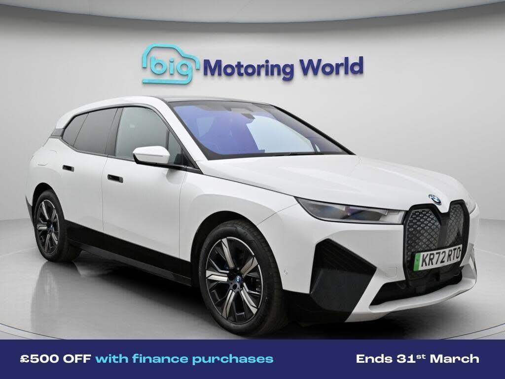 £500 towards your finance depo-Our BMW iX comes with optional extras worth £3,430. Specification includes a range of fantastic features including £500 towards your finance deposit, Panoramic Roof, All Wheel Drive, Sun Protection Pack, Head up Display, Apple CarPlay, Harman Kardon Speakers, Soft Close Doors, Connected Package Professional, Privacy Glass Specification information is supplied by CAPHPI and may vary to the actual car. This data does not form any part of a buying contact. Please check specification prior to purchase in-store. The MOT is valid until February 2027, visit bigmotoringworld.co.uk for more photos, a 360 tour, service history and a free HPI report.Were BIG on peace of mind and this White BMW iX has completed our comprehensive 200 point inspection and passed all checks. Its ready for you to drive away with immediate collection in-store. We include a 90-day warranty as standard plus an option to extend for up to 3 years.Reserve this car exclusively for you, safely and securely at bigmotoringworld.co.uk, with a fully refundable £99 deposit. Test drive before you buy, with no commitment, no hassle and a completely haggle free experience. Still searching and want to see thousands more cars? We are BIG on choice with over 8000 cars to choose from.Visit our award winning web site bigmotoringworld.co.uk.Were Big Motoring World and were BIG on what matters to you.