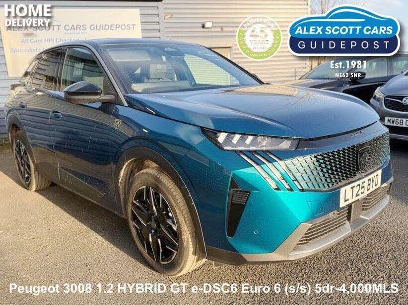 This 2025 Peugeot 3008 GT is a remarkable find, boasting an incredibly low mileage of just 4000 miles and a full dealership service history from its single owner. This stylish GT variant is powered by an efficient 1.2 litre petrol hybrid engine, meeting Euro 6 emission standards. It comes equipped with desirable features such as automatic dual zone climate control, adaptive cruise control with stop and go functionality, and a quick launch cabin heating and cooling function for immediate comfort. Practicality is also key, with a smartphone wireless charger and front parking sensors included.The Peugeot 3008 GT stands out with its impressive fuel economy, achieving a highlight of 53 miles per gallon, which indicates it is more economical than many similar vehicles. Furthermore, its low CO2 emissions are a testament to its modern hybrid technology, making it a more environmentally conscious choice. You will also appreciate the generous boot space, offering ample room for all your luggage and shopping needs, further enhancing its appeal as a versatile and practical vehicle.-Peugeot Warranty Til 06/ 2028-ALEX SCOTT CARS GUIDEPOST Award Winning Family Run Business Since 1981 TEL 01670 823777