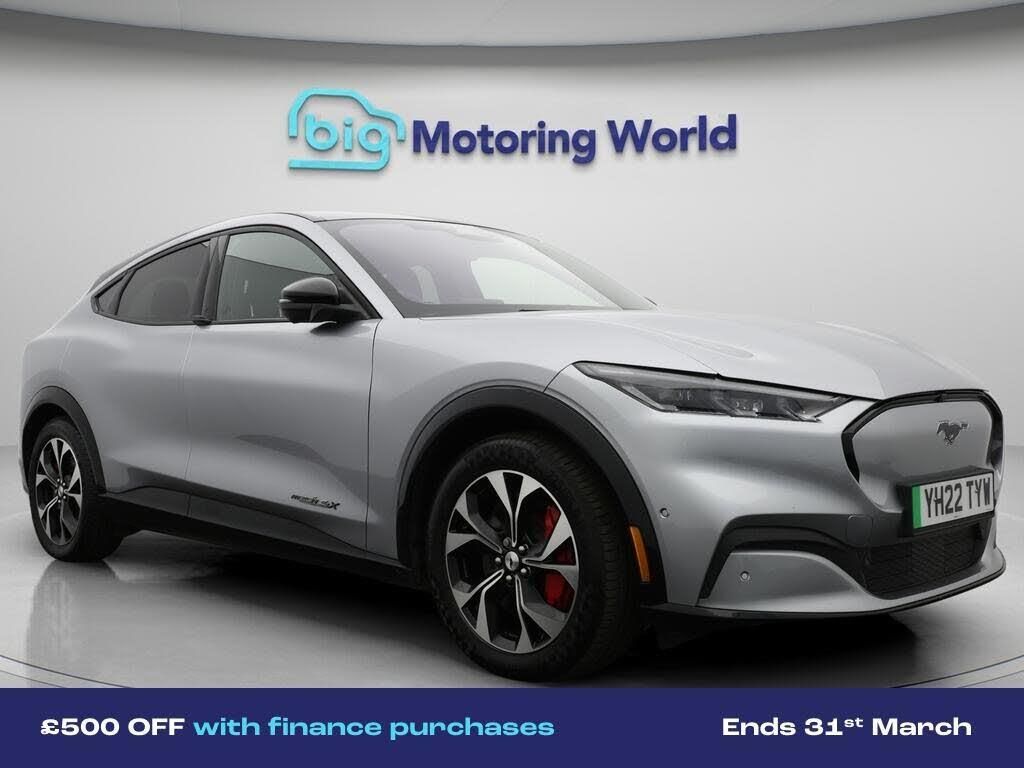 £500 towards your finance depo-Our Ford Mustang Mach-E is finished in Silver. Specification includes a range of fantastic features including £500 towards your finance deposit, Panoramic Roof, All Wheel Drive, 19'' Alloy wheels, Leather Seats, Apple CarPlay, Adaptive Cruise Control, Bang & Olufsen Speakers, Premium Sound System, Privacy Glass Specification information is supplied by CAPHPI and may vary to the actual car. This data does not form any part of a buying contact. Please check specification prior to purchase in-store. The MOT is valid until March 2027, visit bigmotoringworld.co.uk for more photos, a 360 tour, service history and a free HPI report.Were BIG on peace of mind and this Silver Ford Mustang Mach-E has completed our comprehensive 200 point inspection and passed all checks. Its ready for you to drive away with immediate collection in-store. We include a 90-day warranty as standard plus an option to extend for up to 3 years.Reserve this car exclusively for you, safely and securely at bigmotoringworld.co.uk, with a fully refundable £99 deposit. Test drive before you buy, with no commitment, no hassle and a completely haggle free experience. Still searching and want to see thousands more cars? We are BIG on choice with over 8000 cars to choose from.Visit our award winning web site bigmotoringworld.co.uk.Were Big Motoring World and were BIG on what matters to you.