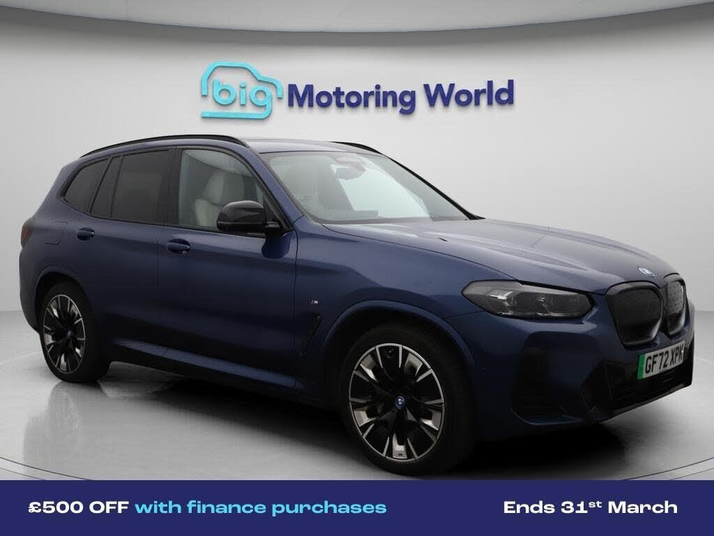 £500 towards your finance depo-Our BMW iX3 is finished in Blue. Specification includes a range of fantastic features including £500 towards your finance deposit, Sun Protection Pack, Head up Display, 20'' Alloy Wheels, Leather Seats, Apple CarPlay, Adaptive Cruise Control, Electric Seats, Harman Kardon Speakers, Electric Panoramic Roof Specification information is supplied by CAPHPI and may vary to the actual car. This data does not form any part of a buying contact. Please check specification prior to purchase in-store. The MOT is valid until November 2026, visit bigmotoringworld.co.uk for more photos, a 360 tour, service history and a free HPI report.Were BIG on peace of mind and this Blue BMW iX3 has completed our comprehensive 200 point inspection and passed all checks. Its ready for you to drive away with immediate collection in-store. We include a 90-day warranty as standard plus an option to extend for up to 3 years.Reserve this car exclusively for you, safely and securely at bigmotoringworld.co.uk, with a fully refundable £99 deposit. Test drive before you buy, with no commitment, no hassle and a completely haggle free experience. Still searching and want to see thousands more cars? We are BIG on choice with over 8000 cars to choose from.Visit our award winning web site bigmotoringworld.co.uk.Were Big Motoring World and were BIG on what matters to you.