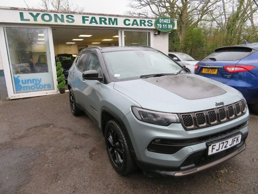 New Arrival | Awaiting Preparation. A top-seller at Lyons Farm Cars, the Jeep Compass is a tough looking family SUV with impressive capabilities. Good looking design, spacious and practical... This Plug-in hybrid option has updated tech giving the Jeep Compass a competitive edge in the mid-size SUV sector. With a minor exterior facelift, the new 4xe has a smart infotainment system, and in 4xe guise has impressive off-road performance. The 4xe (four wheel drive technology) gives you the choice of running on electric only, petrol only or combined. This rare Upland comes with full service history (5 x service records) including a new service and detailed inspection on arrival to us. One Owner. Sold with a new 12 month MOT with no advisories. Automatic. Four Wheel Drive. Plug-in Hybrid. The Upland includes very desirable features such as; Heated Front Seats, Heated Steering Wheel, ParkView Rear Back Up Camera, Front Parking Sensors, ParkSense Rear Park Assist System, 10.1" UConnect Colour Display with Navigation and DAB Radio, Wireless Charging Pad, Deep Tinted Privacy Glass, 18" Gloss Black Alloy Wheels, 10.25" Colour Display TFT Instrument Cluster, Active Lane Management, Forward Collision Warning Plus Mitigation, Dual Zone Temperature Control with Pre-Conditioning Capability and Heater, Adaptive Cruise Control with Stop and Go, Selec-Terrain System with Sport Mode, Bluetooth Streaming Audio, Passive Entry with Keyless Go, Automatic Smartbeam LED Reflector Headlamps, LED Front Fog Lights, LED Tail Lamps, Black Slide Roof Rails, Black Window Surrounds, Gloss Black Grille with Metakrome Bronze Rings, Rain Sensitive Windscreen Wipers, Automatic Electronic Hold Brake, Auto Dimming Rear View Mirror, Power Folding Mirrors, Front + Rear Electric Windows, USB A and C Type Ports, 12V Power Socket, Spare Remote Key. 2022 (72 plate) Jeep Compass 1.3 GSE T4 11.4kWh Upland 5 Door Automatic Four Wheel Drive SUV finished in the expensive optional Azure Blue with Black Roof. Euro 6 / ULEZ Compliant. ---------- Over 1,000 5* Customer Reviews across Facebook, Autotrader and Google! HPI Clear. Low Rate Finance available. RAC Dealer, Open 7 days a week, Part Exchange Welcome, Family established business since 2004, No pressure selling or targets just friendly and honest advice. Call Lyons Farm Cars on 01403 791199 or visit www.lyonsfarmcars.co.uk for more information and photos. Follow us on Facebook to enter our FREE competitions www.facebook.com/LyonsFarmCars.
