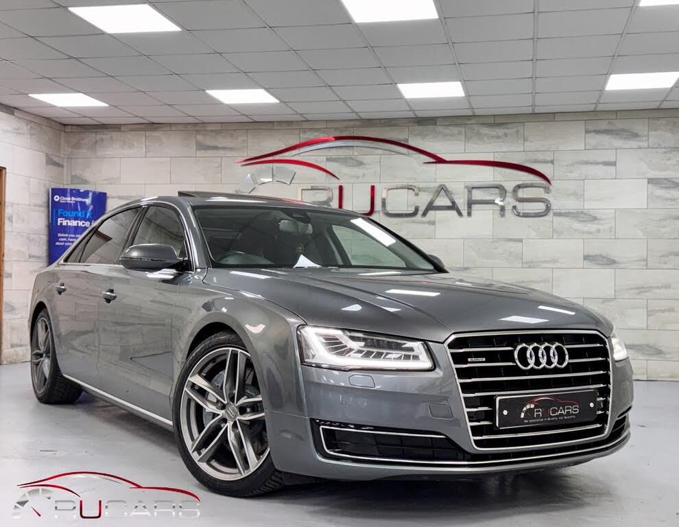 This 2014 '64' Audi A8L 4.0 TFSi SE Exec Quattro is finished in Monsoon Grey with Black Valcona Leather interior.