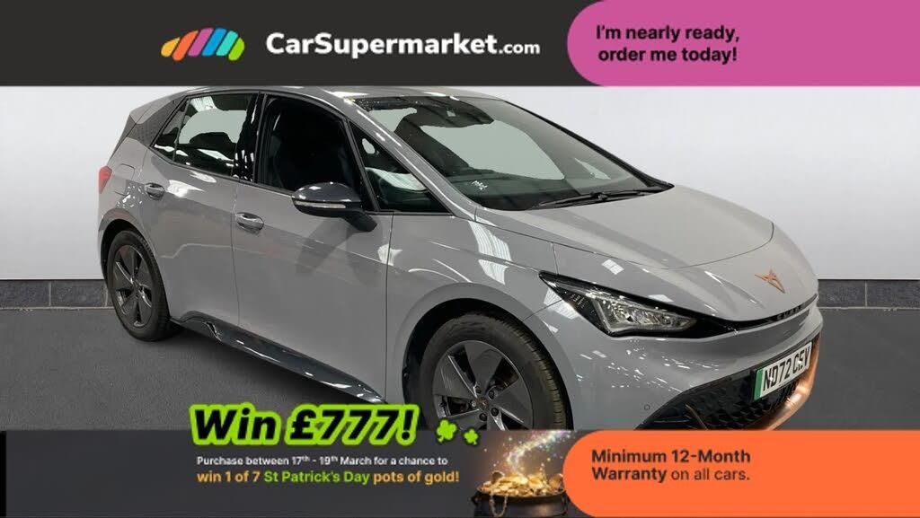 5.3" digital cockpit with 12" central display infotainment system,Bluetooth without wireless charger,Driving profile selection - Range, Comfort, Performance, Individual,Dynamic steering,Emergency steering support with turn assist,Forward collision warning with automatic braking,Front/rear park distance control,Lane assist,PAS,Tailgate,Voice assistant,Wireless full link smartphone integration,120kW DC charging capacity,Shock absorption in front,Sports rear shock absorption,2x USB sockets in front,2x USB sockets in rear, charge only,DAB (Digital Audio Broadcasting) and AM/FM radio,Acoustic windshield,Auto dimming rear view mirror,Daytime running lights,Electric adjustable/heated/folding door mirrors,Full LED headlights,Grey exterior mirrors,Heat insulated glass,LED 3rd brake light,LED rear lights,Rear side wing doors,Rear wiper,Transport protection film,Variable intermittent wiper,Welcome home function and adverse weather function,Windshield wiper with light/rain sensor,3 seat bench in 2nd row,Aluminium pedals,CUPRA emblem on steering wheel,Dual zone climate control,Electric auxiliary air heater,Heated leather wrapped multi function steering wheel,Integrated front head restraints,ISOFIX points in outer rear seats with top tether anchorage points,Manual height adjustable front seats,Multi-colour ambient interior lighting,Rear headrests,SEAQUAL Yarn cloth upholstery,Single front passenger seat,Sunvisors with illuminated mirror,Unsplit rear seat bench, split folding backrest, without centre armrest,3 point seatbelts on all rear seats,Driver and front passenger airbags with front passenger airbag deactivation, side airbag in front with curtain airbag and front interaction airbag,Extended safety system with proactive passenger protection system,Manual child lock in rear doors,Public e-call,Tiredness recognition system, driver alert system,Tyre pressure monitoring system,Visual and acoustic seat belt reminder,Anti theft alarm system with interior monitoring in cab, backup horn and towing protection,Anti theft wheel bolts,Keyless go central locking system,18" Cyclone alloy wheels,Tool kit,Tyre repair kit