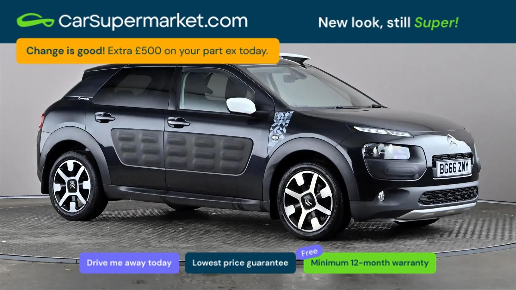 Bluetooth, Cruise Control, Sat Nav, Digital Radio, 17" Alloy Wheels;Citroen C4 Cactus 1.6 BlueHDi Rip Curl (Black) A distinctive and efficient hatchback offering comfort and practicality. Includes a panoramic sunroof, a rear view camera, satellite navigation, Bluetooth connectivity, digital radio and cruise control. Also features 17-inch alloy wheels for added style. Supplied with a 159-point inspection and a minimum 12-month warranty. Last serviced on 07/11/2025. MOT due 21/11/2026.