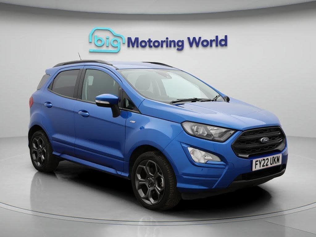 Part Leather Seats,Apple CarPl-Our Ford EcoSport comes with optional extras worth £1,125. Specification includes a range of fantastic features including Part Leather Seats, Apple CarPlay, Bang & Olufsen Speakers, Cooled Glovebox, Satellite Navigation, Ford SYNC, Privacy Glass, ST Style Pack, Heated Windscreen, Rear View Camera Specification information is supplied by CAPHPI and may vary to the actual car. This data does not form any part of a buying contact. Please check specification prior to purchase in-store. The MOT is valid until March 2027, visit bigmotoringworld.co.uk for more photos, a 360 tour, service history and a free HPI report.Were BIG on peace of mind and this Blue Ford EcoSport has completed our comprehensive 200 point inspection and passed all checks. Its ready for you to drive away with immediate collection in-store. We include a 90-day warranty as standard plus an option to extend for up to 3 years.Reserve this car exclusively for you, safely and securely at bigmotoringworld.co.uk, with a fully refundable £99 deposit. Test drive before you buy, with no commitment, no hassle and a completely haggle free experience. Still searching and want to see thousands more cars? We are BIG on choice with over 8000 cars to choose from.Visit our award winning web site bigmotoringworld.co.uk.Were Big Motoring World and were BIG on what matters to you.