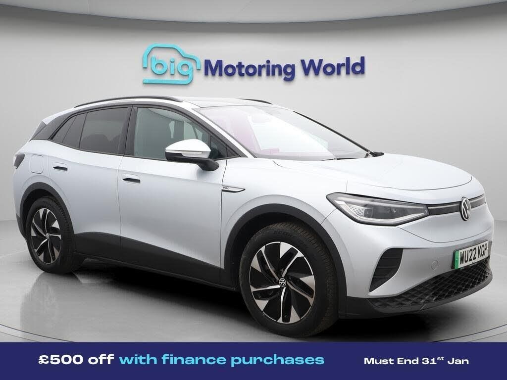 £500 towards your finance depo-Our Volkswagen ID.4 comes with optional extras worth £1,685. Specification includes a range of fantastic features including £500 towards your finance deposit, Panoramic Roof, 19'' Alloy wheels, Part Leather Seats, Apple CarPlay, Adaptive Cruise Control, Android Auto, Satellite Navigation, Privacy Glass, Heated Seats Specification information is supplied by CAPHPI and may vary to the actual car. This data does not form any part of a buying contact. Please check specification prior to purchase in-store. The MOT is valid until February 2027, visit bigmotoringworld.co.uk for more photos, a 360 tour, service history and a free HPI report.Were BIG on peace of mind and this Silver Volkswagen ID.4 has completed our comprehensive 200 point inspection and passed all checks. Its ready for you to drive away with immediate collection in-store. We include a 90-day warranty as standard plus an option to extend for up to 3 years.Reserve this car exclusively for you, safely and securely at bigmotoringworld.co.uk, with a fully refundable £99 deposit. Test drive before you buy, with no commitment, no hassle and a completely haggle free experience. Still searching and want to see thousands more cars? We are BIG on choice with over 8000 cars to choose from.Visit our award winning web site bigmotoringworld.co.uk.Were Big Motoring World and were BIG on what matters to you.
