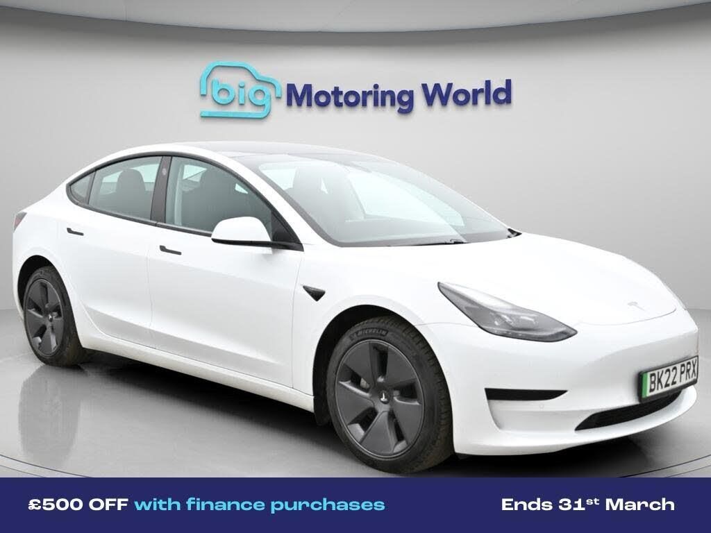 £500 towards your finance depo-Our Tesla Model 3 is finished in White. Specification includes a range of fantastic features including £500 towards your finance deposit, Adaptive Cruise Control, Heated Seats, Wireless Phone Charging, Bluetooth, Blind Spot Assist, Parking Sensors, 2 Zone Climate, Cruise Control, Climate Control Specification information is supplied by CAPHPI and may vary to the actual car. This data does not form any part of a buying contact. Please check specification prior to purchase in-store. The MOT is valid until January 2027, visit bigmotoringworld.co.uk for more photos, a 360 tour, service history and a free HPI report.Were BIG on peace of mind and this White Tesla Model 3 has completed our comprehensive 200 point inspection and passed all checks. Its ready for you to drive away with immediate collection in-store. We include a 90-day warranty as standard plus an option to extend for up to 3 years.Reserve this car exclusively for you, safely and securely at bigmotoringworld.co.uk, with a fully refundable £99 deposit. Test drive before you buy, with no commitment, no hassle and a completely haggle free experience. Still searching and want to see thousands more cars? We are BIG on choice with over 8000 cars to choose from.Visit our award winning web site bigmotoringworld.co.uk.Were Big Motoring World and were BIG on what matters to you.