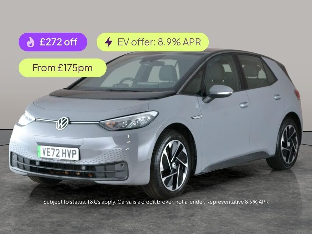 Step into the future with this stylish grey Volkswagen ID.3. Enjoy seamless connectivity with Apple CarPlay, wireless charging, and Bluetooth audio streaming. Safety and ease are at your fingertips thanks to Adaptive Cruise Control, Blind Spot Assist, and front and rear parking sensors. The Assistance Pack and Comfort Pack add extra convenience, while LED headlights ensure superb visibility. Experience pure driving pleasure with digital climate control and custom driving modes, all in a smart, electric hatchback. 1 service recorded, last serviced on 22/01/2025 at 20,583 miles. MOT to 15/01/2027. Visit our website for service history, online valuation, full vehicle specification plus multiple images. This vehicle is VAT qualifying. Any feature/option specified here is from 3rd party data. We cannot guarantee the accuracy of any specification supplied by a 3rd party. We recommend that you physically check the specification of the vehicle on site prior to purchase. This information does not form part of the buying contract. Terms & Conditions apply. We have over 2,000 cars available from our 10 national branches, check our website to see all our stock. Our Trustpilot rating is 4.4/5 with over 9,000 reviews.