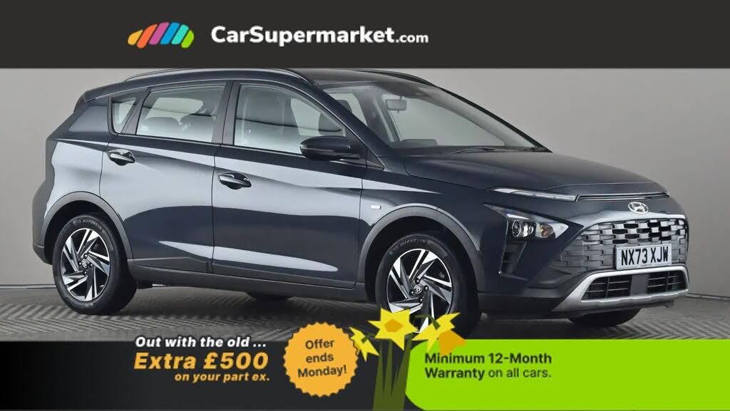 Bluetooth, Cruise Control, Lane Departure Warning, Apple CarPlay, Android Auto, Parking Sensors;Hyundai Bayon 1.0 TGDi MHEV SE Connect (Grey) A compact crossover with mild hybrid efficiency. Includes Apple CarPlay/Android Auto, cruise control, lane departure warning and parking sensors. Optional Aurora Grey paint (£600.00). Minimum 12-month warranty. Last serviced 17/03/2026. MOT due 08/10/2026.