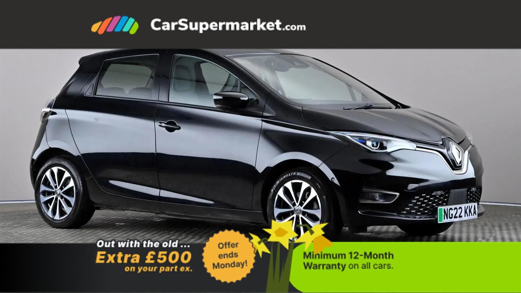 Blind Spot Monitoring, Cruise Control, Sat Nav, Parking Sensors, Lane Departure Warning, Apple CarPlay, Android Auto, Traffic Sign Recognition, Heated Front Seats;Renault Zoe R135 GT Line+ 50kWh (Black) A fully electric hatchback with good range and high specification. Includes sat nav, Apple CarPlay/Android Auto, heated seats, blind spot monitoring and parking sensors. Optional Diamond Black paint and upgraded interior (£600.00). Minimum 12-month warranty. Last serviced 16/03/2026. MOT due 15/03/2027.