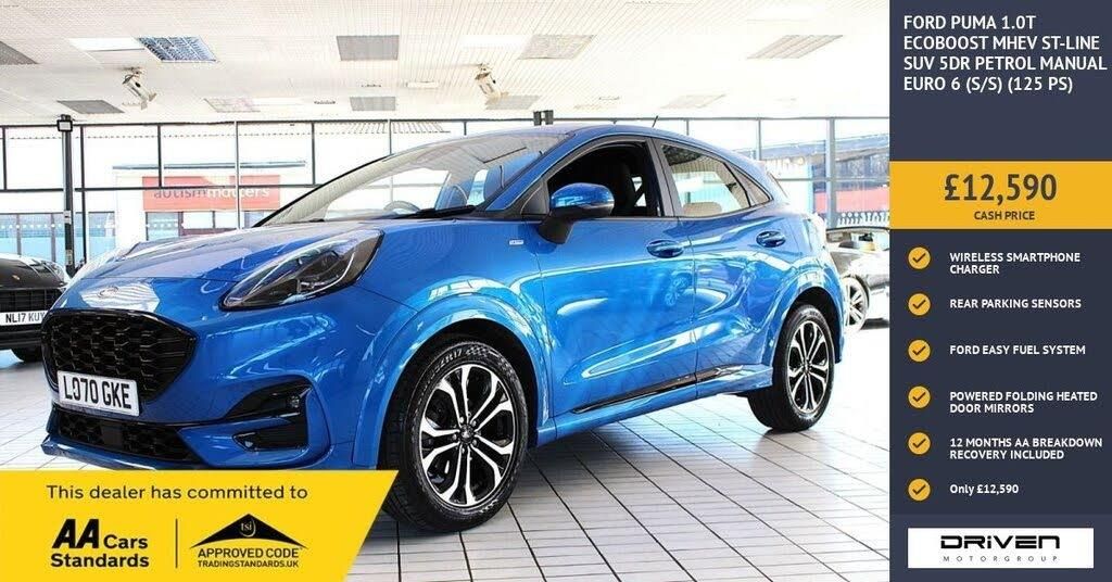 FORD PUMA 1.0T ECOBOOST MHEV ST-LINE FINISHED IN BLAZER BLUE AND COMPLIMENTED WITH TWO TONE CHARCOAL INTERIOR, THIS VEHICLE HAS BEEN VERY WELL CARED FOR AND MAINTAINED PLUS COMPREHENSIVE PRE DELIVERY HEALTH CHECK AND SERVICE COMPLETED PRIOR TO SALE AT 37105 MILES. KEY FEATURES INCLUDE ALLOY WHEELS, AUTOMATIC HEADLIGHTS, KEYLESS GO, HEATED FRONT SEATS, AMBIENT LIGHTING, RER PARKING SENSORS, CRUISE CONTROL WITH SPEED LIMITER, FORD EASY FUEL SYSTEM, MEGABOX EXTENDED BOOT, FORD SYNC 3 SATALLITE NAVIGATION, ST-LINE STYLING, FRONT SPORT SEATS, AIR CONDITIONING, POWER FOLD HEATED DOOR MIRRORS, THATCHAM ALARM, WIRELESS CHARGING PLUS MUCH MORE. COMMITTED TO AA CARS STANDARDS: 3 MONTHS OR 3000 MILES WARRANTY INCLUDED WITH AN OPTION TO UPGRADE: 12 MONTHS AA BREAKDOWN RECOVERY INCLUDED: £75.00 CONTRIBUTION TOWARDS YOUR NEXT SERVICE/MOT AT ANY AA CARS STANDARD APPROVED WORKSHOP: WE STAND BY THE QUALITY OF OUR VEHICLES. WITH THE PURCHASE OF THIS VEHICLE, YOU WILL RECEIVE 3 MONTHS OR 3000 WARRANTY, 12 MONTHS AA BREAKDOWN RECOVERY, GIVING YOU ADDITIONAL PEACE OF MIND AND PROTECTION. ALL OUR CARS COME WITH AT LEAST 6 MONTHS MOT AND PRE SALE HEALTH CHECK AND ROAD TEST. OUR PROFESSIONAL TEAM ENSURES YOUR VEHICLE STAYS IN TOP CONDITION, AND YOU ENJOY A HASSLE-FREE OWNERSHIP EXPERIENCE. 4.7 STARS ON GOOGLE WITH OVER 550 REVIEWS: JOIN OUR COMMUNITY OF SATISFIED CUSTOMERS! OUR DEALERSHIP IS PROUD TO HAVE A 4.7 STAR RATING ON GOOGLE, BACKED BY OVER 550 POSITIVE REVIEWS. WE ARE COMMITTED TO PROVIDING EXCELLENT SERVICE AND HIGH-QUALITY VEHICLES. This Vehicle Comes Equipped with High Specification, Which Includes: - Drive this car home with complete confidence and satisfaction: All cars proudly offered by driven group are rigorously inspected, hpi checked and prepared to the highest standard To drive this car home, visit www.drivegroup.co.uk or call 01642-601999 to arrange an appointment with our sales team Please note we do not operate an organised distance selling scheme as defined by the consumer contracts (cancellation, information and additional charges) regulations 2013. Therefore, even if you choose to not view your vehicle at our premises prior to purchase,you will not be entitled to cancel your order under any 14 day cancellation period. All other statutory rights remain unaffected. Whilst every effort has been made to ensure the accuracy of the information contained in this website, please check with us about any item which may affect your decision to purchase. Driven motor group shall not be liable for any errors, inaccuracies or delays in content.