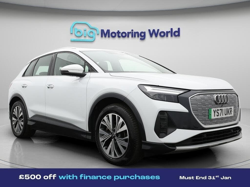 £500 towards your finance depo-Our Audi Q4 e-tron is finished in White. Specification includes a range of fantastic features including £500 towards your finance deposit, 19'' Alloy wheels, Adaptive Cruise Control, Lane Assist, Heated Seats, Bluetooth, Parking Sensors, Audi Parking System, Audi Connect, 2 Zone Climate Specification information is supplied by CAPHPI and may vary to the actual car. This data does not form any part of a buying contact. Please check specification prior to purchase in-store. The MOT is valid until January 2027, visit bigmotoringworld.co.uk for more photos, a 360 tour, service history and a free HPI report.Were BIG on peace of mind and this White Audi Q4 e-tron has completed our comprehensive 200 point inspection and passed all checks. Its ready for you to drive away with immediate collection in-store. We include a 90-day warranty as standard plus an option to extend for up to 3 years.Reserve this car exclusively for you, safely and securely at bigmotoringworld.co.uk, with a fully refundable £99 deposit. Test drive before you buy, with no commitment, no hassle and a completely haggle free experience. Still searching and want to see thousands more cars? We are BIG on choice with over 8000 cars to choose from.Visit our award winning web site bigmotoringworld.co.uk.Were Big Motoring World and were BIG on what matters to you.