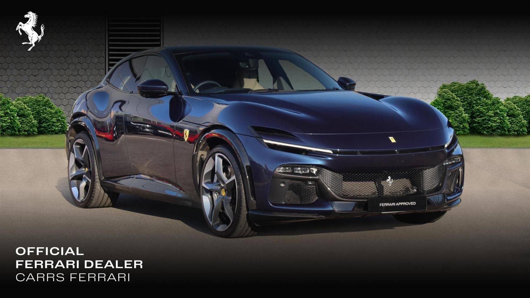 Beautiful GT spec Purosangue in Blue Swaters with Tortora leather interior and Panoramic Roof. This car has forged wheels, unique to the Purosangue. Inside, the car has Style design seats with a combination of Tortora and Blue Sterling leather.