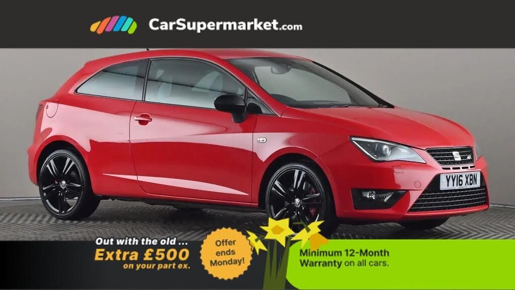 'Lights On' Reminder warning buzzer,Bluetooth system,Digital clock,Low fuel warning light,Outside temperature gauge,Satellite navigation system,SEAT Drive profile,SEAT logo boot release,Service interval indicator,Speed sensitive power steering,Trip computer,Sports suspension,XDS electronic differential lock,6 speakers,Auxiliary input socket,Digital Audio Broadcast (DAB) Tuner,Steering column with mounted audio controls,Auto dimming rear view mirror,Automatic headlights,Automatic rain sensing wipers,Bi-Xenon headlights with adaptive front light system + headlight washers,Body colour door handles,Centre trapezoidal exhaust pipe,Coming home headlight function,Cornering front fog lights,Dark tinted rear windows,Electric folding door mirrors,Electric headlight adjustment,Electrically adjustable and heated door mirrors,Exclusive Cupra front and rear bumpers,Gloss black door mirrors,High gloss black front grille,LED daytime running lights,LED tail lights,One touch electric front windows,Rear wiper,12V accessory power point in centre console,3 cupholders,Boot light,Climate control,Drilled aluminium pedals,Driver/passenger sunvisors and vanity mirrors,Dust/pollen filter,Easy entry and height adjustable passenger seat,Flat bottom sports leather steering wheel,Front courtesy lights,Front door pockets,Front reading lights,Front seat and rear pockets,Height adjustable driver's seat,Height adjustable front/rear head restraints,Height/reach adjust steering wheel,Illuminated glovebox,Isofix system on outer rear seats,Leather gear knob,Rear centre head restraint,Split folding rear seats,Driver pack - Ibiza,Full link media system pack - Ibiza,3 point seatbelts on all 3 rear seats,ABS,Active front headrests,Driver and passenger airbags,ESP+EBA+EDL,Front passenger airbag deactivation,Front side airbags,Multi-Collision braking,Seatbelt warning,Tyre pressure monitoring system,Deadlocks,Electronic engine immobiliser,Locking wheel bolts,Remote central locking,Volumetric alarm with back up horn,17" Barcino alloy wheels in black with red brake callipers,Space saver spare wheel