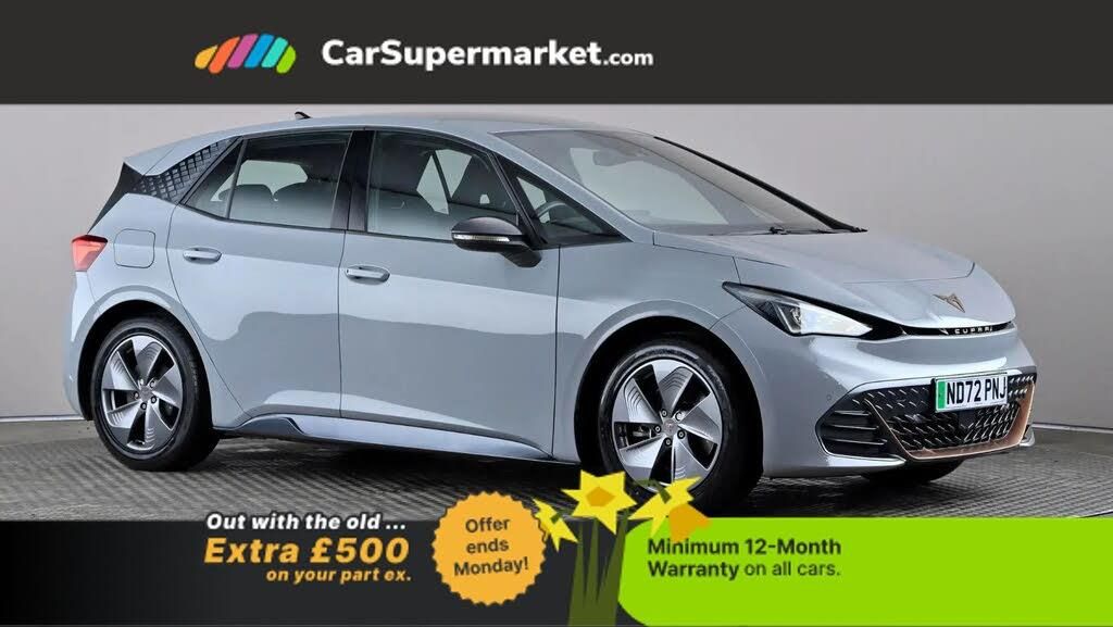 5.3" digital cockpit with 12" central display infotainment system,Bluetooth without wireless charger,Driving profile selection - Range, Comfort, Performance, Individual,Dynamic steering,Emergency steering support with turn assist,Forward collision warning with automatic braking,Front/rear park distance control,Lane assist,PAS,Tailgate,Voice assistant,Wireless full link smartphone integration,120kW DC charging capacity,Shock absorption in front,Sports rear shock absorption,2x USB sockets in front,2x USB sockets in rear, charge only,DAB (Digital Audio Broadcasting) and AM/FM radio,Acoustic windshield,Auto dimming rear view mirror,Daytime running lights,Electric adjustable/heated/folding door mirrors,Full LED headlights,Grey exterior mirrors,Heat insulated glass,LED 3rd brake light,LED rear lights,Rear side wing doors,Rear wiper,Transport protection film,Variable intermittent wiper,Welcome home function and adverse weather function,Windshield wiper with light/rain sensor,3 seat bench in 2nd row,Aluminium pedals,CUPRA emblem on steering wheel,Dual zone climate control,Electric auxiliary air heater,Heated leather wrapped multi function steering wheel,Integrated front head restraints,ISOFIX points in outer rear seats with top tether anchorage points,Manual height adjustable front seats,Multi-colour ambient interior lighting,Rear headrests,SEAQUAL Yarn cloth upholstery,Single front passenger seat,Sunvisors with illuminated mirror,Unsplit rear seat bench, split folding backrest, without centre armrest,3 point seatbelts on all rear seats,Driver and front passenger airbags with front passenger airbag deactivation, side airbag in front with curtain airbag and front interaction airbag,Extended safety system with proactive passenger protection system,Manual child lock in rear doors,Public e-call,Tiredness recognition system, driver alert system,Tyre pressure monitoring system,Visual and acoustic seat belt reminder,Anti theft alarm system with interior monitoring in cab, backup horn and towing protection,Anti theft wheel bolts,Keyless go central locking system,18" Cyclone alloy wheels,Tool kit,Tyre repair kit