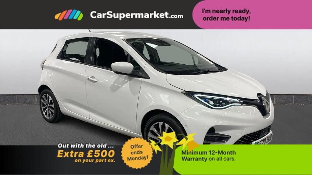 10" TFT Driver information display,Blind spot warning,Charging cable (Type 2),Cruise control + speed limiter,Cruise control switches on steering wheel,Driving style indicator,Eco mode,Econometer,Electric power steering,Lane departure warning system (LDW),Lane keeping assistant (LKA),Over speed prevention,Range indicator,Range optimizer,Slow speed pedestrian warning,Smartphone integration compatible with Apple CarPlay and Android Auto,Traffic sign recognition (TSR),Battery charge indicator,Chameleon charger AC 2-22kW,2 USB sockets in rear,Steering wheel mounted controls,Auto dimming rear view mirror,Automatic hazard lights activation under emergency braking,Automatic headlights + automatic windscreen wipers,Automatic high/low beam,Automatic rain sensing wipers,Body colour bumpers,Body colour door mirrors,Body colour front door handles,Chrome grille,Chrome surround on front fog lamps,Driver one touch and passenger electric windows,Electric rear windows,Electrically operated heated and folding mirrors,Front fog lights,Full LED headlamps with C-shape LED daytime running lights,Heated rear windscreen,Hot stamped grille,Tinted rear windows,12V socket in lower dashboard,3 rear head restraints,Automatic air conditioning,Driver/passenger sunvisors and vanity mirrors,Drivers seat with longitudinal adjustment and recline,Front charging socket,Front door storage bins with bottle holder,Front head restraints,Gear shift indicator,Glovebox,Height/reach adjust steering wheel,ISOFIX on front passenger and rear outer seats,PET soft touch steering wheel,Soft armrests in door panels,Split folding rear seats,Stowage pocket in front passenger seat back,Synthetic leather/cloth upholstery,Twin front cupholders,Technology pack - Zoe,3 point seatbelts on all rear seats,Anti-lock braking system (ABS),Automatic parking brake,Child locks on rear doors,Driver/Front Passenger airbags,ESP + ASR traction control + CSV understeer control,Front passenger airbag deactivation,Height adjustable front seatbelts,Hill start assist,Rear disc brakes,Seatbelt pretensioners with load limiters,Seatbelt warning,Tyre pressure monitor,Deadlocking system,Electronic engine immobiliser,Hands free Renault card,RAID (Renault Anti-Intruder Device) with automatic door locking,Remote central locking,Tyre repair kit,Glacier White,Synthetic Leather-Recycled Cloth - Black