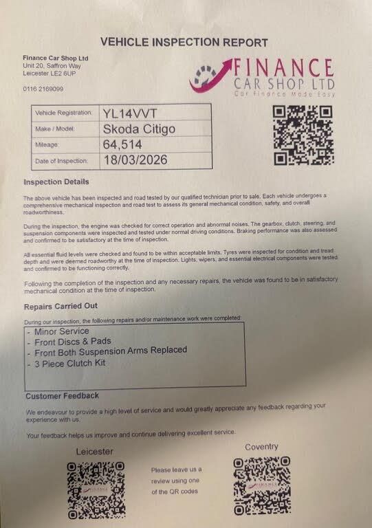 SERVICE HISTORY, JUST SERVICED, 1 FORMER KEEPER,HEATED SEATS, SATELLITE NAVIGATION, PANORAMIC ROOF, This Skoda Citigo Elegance is a reliable, economical, and easy-to-drive city car. With its efficient 1.0 MPI engine and compact size, its perfect for first-time drivers, commuters, or anyone looking for a low-cost runaround. Despite its small size, it offers a surprisingly spacious interior and practical 5-door access. Key Features:1.0 MPI Petrol Engine Excellent fuel economyGreenTech Stop/Start Technology (s/s)5 Doors Easy access for passengersAlloy WheelsAir ConditioningHeated Front SeatsBluetooth ConnectivityElectric Front WindowsRemote Central LockingLeather Steering WheelRear Parking Sensors Why Buy This Skoda Citigo?Very economical and low running costsEasy to park and driveIdeal first car or city commuterPractical and reliable+ 6 MONTHS WARRANTY INCLUDED + 6 MONTHS BREAKDOWN COVER + EXTENDED WARRANTY AVAILABLE + FINANCE OPTIONS AVAILABLE UPON REQUEST + DELIVERY CAN ONLY BE ARRANGED ONCE THE VEHICLE HAS BEEN VIEWED & INSPECTED IN PERSON AT OUR PREMISES + PHOTO ID IS REQUIRED FOR ALL VIEWINGS AND TEST DRIVES + WE CAN BE REACHED VIA WHATSAPP ON 07458 300017 FEEL FREE TO MESSAGE US + PLEASE NOTE, THE PRICE IS FIXED ON THIS VEHICLE. KINDLY BE AWARE OF THIS PRIOR TO ARRANGING A VIEWING + WE HAVE OVER 50 VEHICLES IN STOCK. AS NOT ALL VEHICLES ARE HELD ON SITE, PLEASE ENSURE YOU CALL IN ADVANCE BEFORE MAKING YOUR JOURNEY + BANK TRANSFER ONLY + MORE CARS AVAILABLE AT:WWW.FINANCECARSHOPLTD.CO.UK +-SERVICE HISTORY, JUST SERVICED-+ WHATSAPP US ON 07458 300017 + OPEN 7 DAYS A WEEK + BANK TRANSFER ONLY + VIEWING BY APPOINTMENT +