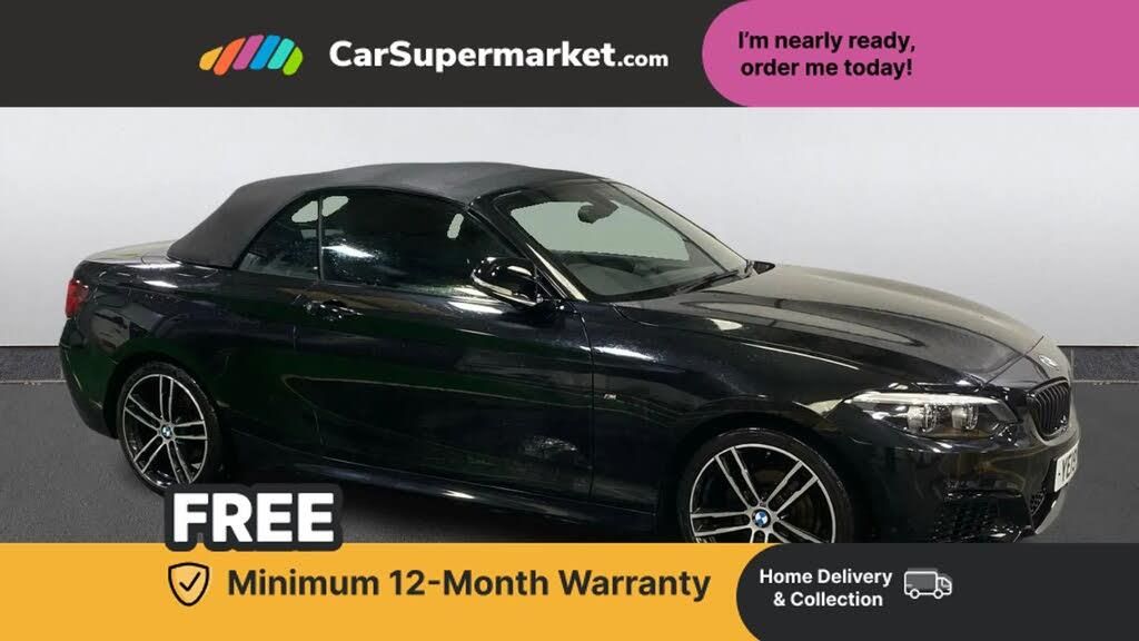 Digital Radio, Heated Seats, Heated Steering Wheel, Parking Sensors, Cruise Control, LED Headlights;A stylish BMW 218i M Sport Convertible finished in black, offering sporty design and the enjoyment of open-top driving. The vehicle includes digital radio and is enhanced by a range of desirable factory optional extras including Black Sapphire paint, Convertible Comfort Package, cruise control with brake function, extended storage, Interior Comfort Package, front and rear Park Distance Control, heated seats for the driver and front passenger, heated steering wheel and wind deflector. The interior is finished in Hexagon Cloth-Alcantara upholstery in anthracite with blue highlights and high-gloss black trim with pearl chrome finishers. The total cost of optional equipment fitted to this vehicle is £3,340.