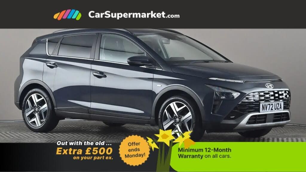 Sat Nav, Bluetooth, Cruise Control, Lane Departure Warning, Apple CarPlay, Android Auto, Parking Sensors, Wireless Phone Charging, Privacy Glass, Automatic Climate Control, Heated Front Seats, Heated Steering Wheel, Rear View Camera;Hyundai Bayon 1.0 TGDi 48V MHEV Premium (Grey) Mild-hybrid crossover with excellent specification including satellite navigation, Apple CarPlay, Android Auto, cruise control, lane departure warning, wireless phone charging and privacy glass. Also features heated seats, heated steering wheel, rear view camera and automatic climate control. Finished in Aurora Grey (£600 option). Last serviced 20 January 2026, MOT due 24 November 2026.