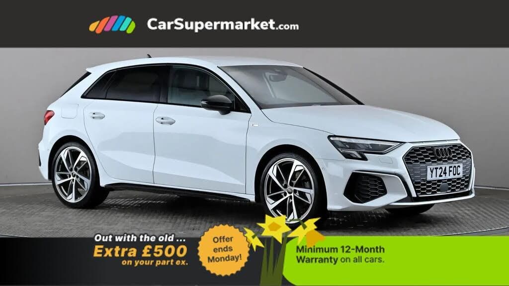 Audi drive select (Auto, Comfort, Dynamic, Efficiency and Individual),Audi smartphone interface,Audi Virtual Cockpit - 10.25" digital and colour instrument cluster,Automatic start/stop system with recuperation,Bluetooth interface,Camera based traffic sign recognition,Collision avoidance assistant,e-Call (emergency call),Electromechanical power speed sensitive steering,Lane departure warning system,MMI Navigation Plus with high resolution 10.1" colour touch screen display,Service indicator,Trip computer,Voice control system with natural language interaction,Sports suspension,2xUSB-C connection with data and charging functions,6 passive loudspeakers,DAB Digital radio,3rd brake light,Acoustic glass windscreen,Audi beam uses LEDs to project the Audi logo onto the ground as you exit your A3,Auto dimming frameless rear view mirror,Electrically adjustable/heated/folding/auto dimming door mirrors with integrated LED indications + kerb view function for passenger side,Front electric windows,Illuminated door sills with aluminium inserts at the front with S logo,LED daytime running lights,LED headlights with LED rear lights and dynamic rear indicators,Light and rain sensors,Privacy glass - dark tinted rear window, rear door and side windows,Rear electric windows,Rear side air outlets in grained matt black,Rear side wing doors,Rear wiper,S roof spoiler,12V socket and storage compartment in front centre console,3 seat bench in 2nd row,3 spoke flat bottomed leather multifunction sport steering wheel with gear shift paddles,4 way electrically adjustable lumbar support for driver and front passenger,60/40 split folding rear seat bench,Black cloth headlining,Dual zone electronic climate control,Front and rear centre armrest in artificial leather,Front and rear headrests,Height and reach adjustable steering wheel,Interior lighting - glove compartment light and right hand side,Luggage compartment floor covering,Manual boot compartment lid,Seat side bolsters,Single front passenger seat,Stainless steel pedals and front footrest in black,Twin leather upholstery with front sports seats S embossed logo,Aluminium interior elements pack - A3 Sportback,Black styling pack - A3 Sportback/Black edition,LED interior lighting pack - A3 Sportback,3x3 point rear seat belts,Driver and front passenger airbag with passenger airbag deactivation,Electronic Stabilisation Control (ESC) including ABS, ASR and EDL,First aid kit with warning triangle and 2 safety vests,Front side airbags with head airbags and interaction airbag,Pre-sense front with pedestrian and cyclist detection,Seatbelt monitoring,Tyre pressure loss indicator,Anti theft alarm,Anti-theft wheel bolts,Electronically operated child locks,Immobiliser,Remote control central locking,Dark spectrum aluminium inlays, accent surfaces in the dashboard and centre console in platinum grey silk effect paint finish,19" 5 arm trapezoid design alloy wheels in matt grey with diamond cut finish