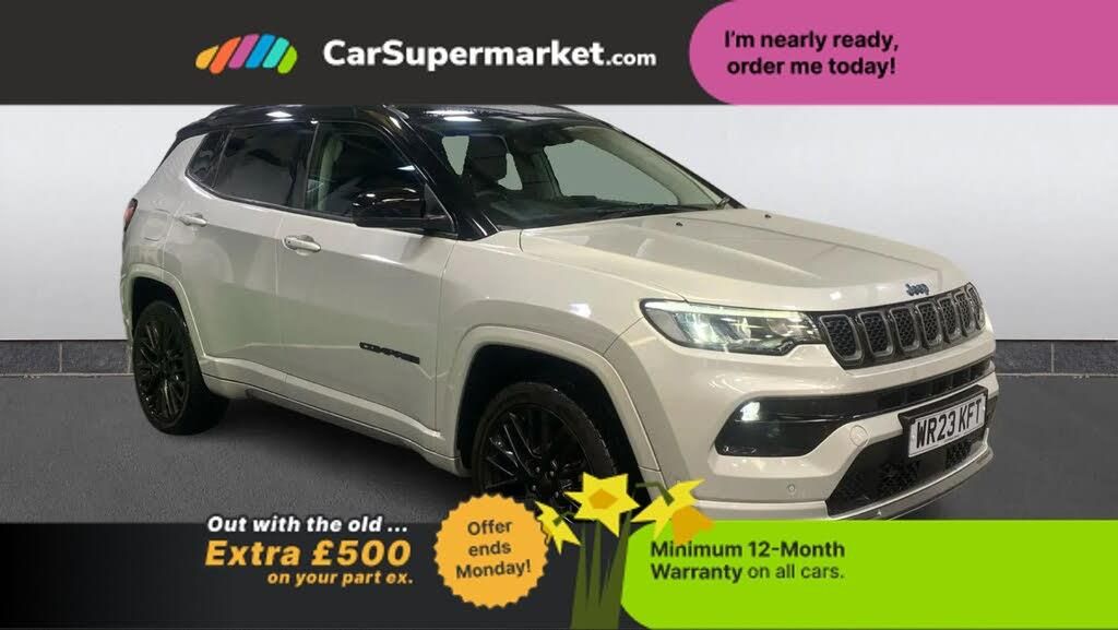 Adaptive Cruise Control, Cruise Control, Traffic Sign Recognition, Wireless Phone Charging, Bluetooth, Digital Radio, Sat Nav, Privacy Glass, Heated Front Seats, Heated Steering Wheel;This Jeep Compass plug-in hybrid blends efficiency with rugged style. It features navigation, adaptive cruise control, heated seats, rear camera, and parking sensors. Highlights include adaptive cruise control, traffic sign recognition, wireless phone charging, Bluetooth, digital radio, privacy glass, heated front seats, and heated steering wheel. Optional extras include Glacier with Black Roof and ventilated leather seats for £2,350.00.