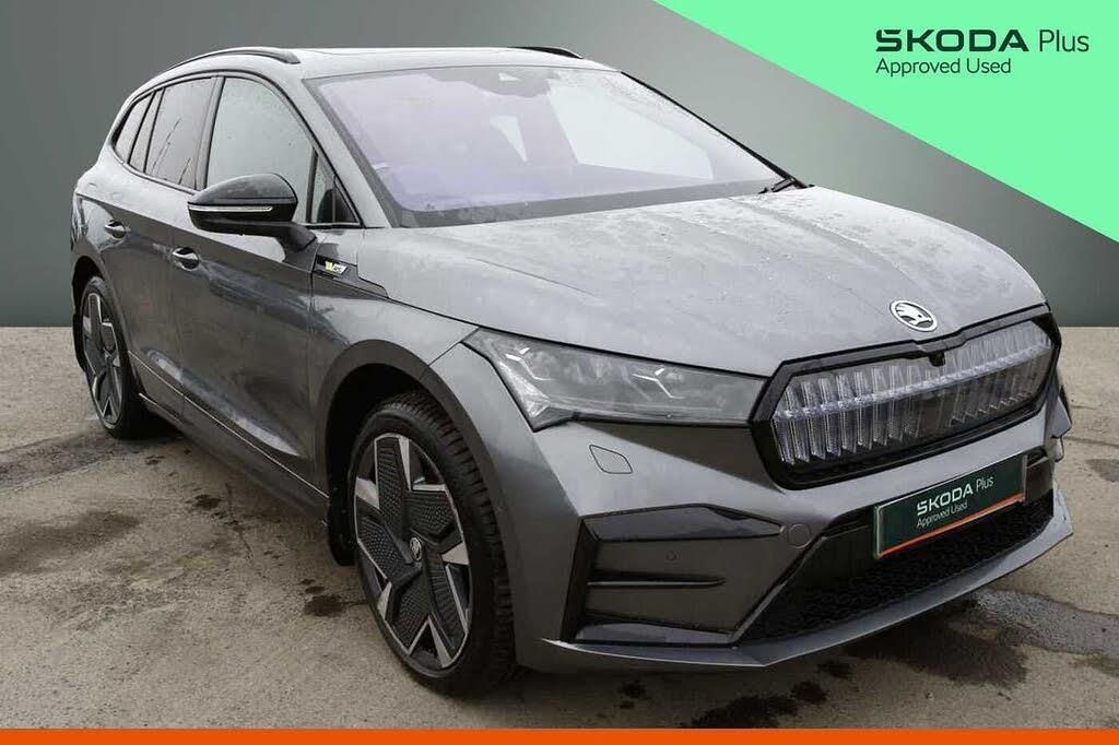 Exterior Features, Metallic paint, Panoramic sunroof, Wheels, 21" Vision Anthracite metallic alloy wheels with seal technology tyres, Packs, vRS Suite design pack - Enyaq, Paint - Metallic, Metallic - Graphite grey, Trim - Leather, vRS Suite design pack - Black perforated leather with black stitching and piping, Exterior Features, Electric front and rear windows, Heat insulating darkened glass in side and rear windows, Heat insulating glass in windshield, Heated rear window, Heated washer nozzles, Privacy glass and acoustic side windows, Rain and light sensors, Rear window wiper with washer system and intermittent control, Rear wiper, Variable front intermittent wipers, Shock absorption in front, Shock absorption in rear, Black decorative trims (including window and grille surround), Black roof rails, Body colour bumpers, Body colour door mirrors and handles, Body colour door sills, Chrome side window surrounds, Crystal face, Dashboard and door moulding light in multiple colours, Radiator grille in gloss black, Rear side wing doors, Safety reflectors on front and rear doors, Skoda lettering on tailgate in black, vRS sports bumpers, Dynamic headlight range control with cornering light function, Front fog lights, Full LED Matrix beam headlights with variable light distribution, Full LED rear lights with variable lighting functions, Headlight washers, LED daytime running lights, LED third brake light, Light assistant (coming home/tunnel light), Safety, ESC (incl. ABS+MSR+ASR+EDS+HBA+DSR+RBS+MKB), Front assist with assisted automatic braking, Front disc brakes, Rear drum brakes, Adaptive cruise control, Blind Spot Detection (BAS), Drive mode selector, Driver alert system, Electronic engine sound, Front and rear parking sensors, Progressive steering, Rear view camera, Skoda Connect iV remote services with charging, air conditioning and smart schedules, Speed assist, Speed limiter, Traffic sign recognition, Auto dimming rear view mirror, Door mirror memory, Electric adjustable heated folding door mirrors with boarding spots and welcome logo, 3 point height adj front seatbelts + pretensioners, Auto door release and activation of warning lights in the event of an accident, Central interaction airbag, Crew protection assist, Driver and front passenger airbags, Front and rear three point safety belt on all seats, Front passenger airbag deactivation switch, Front side airbags with curtain airbags, Power child locks, Rear side airbags, Single tone horn, Tyre pressure monitor, Visual and acoustic seat belt reminder, Warning lights in front doors, Audio / Communications, Bluetooth system, E-call, Voice control system, Wi-Fi hotspot, Wireless charging, 8 Speakers, DAB Digital radio, USB-C ports (charging + data) front and rear, Driver Convenience, Electrically operated tailgate with kick activation (virtual pedal), Tailgate unlocking from outside, Miscellaneous, 13" touchscreen display, Digital cockpit, Exterior temperature indicator, Gesture control, Satellite navigation system, Travel assist with emergency assist, lane assist plus with narrow lane assist and urban evasive steering support, Washer fluid level indicator, Wireless smartlink, Interior Features, Pollen filter, Tri zone climate control, 12V socket in boot, 1x umbrella, 3-spoke black leather heated sports multifunction steering wheel with black stitching and paddles for recuperation level selection, 4 foldable roof handles with rear coat hooks, Aluminium pedals, Coat hooks on B pillar, Extended interior noise suspension, Front centre armrest, High centre console, Illuminated and cooled glovebox, Laminated soft-touch plastic knee rest, Manual rear window blind, Manually adjustable steering column, Rear storage compartment, Sliding boot cover, Boot lighting, Front and rear footwell lighting, Front courtesy lights, Front reading lights, Interior door handle lighting in front and rear, LED ambient lighting, Luggage compartment lighting, Rear reading lights, Four whe