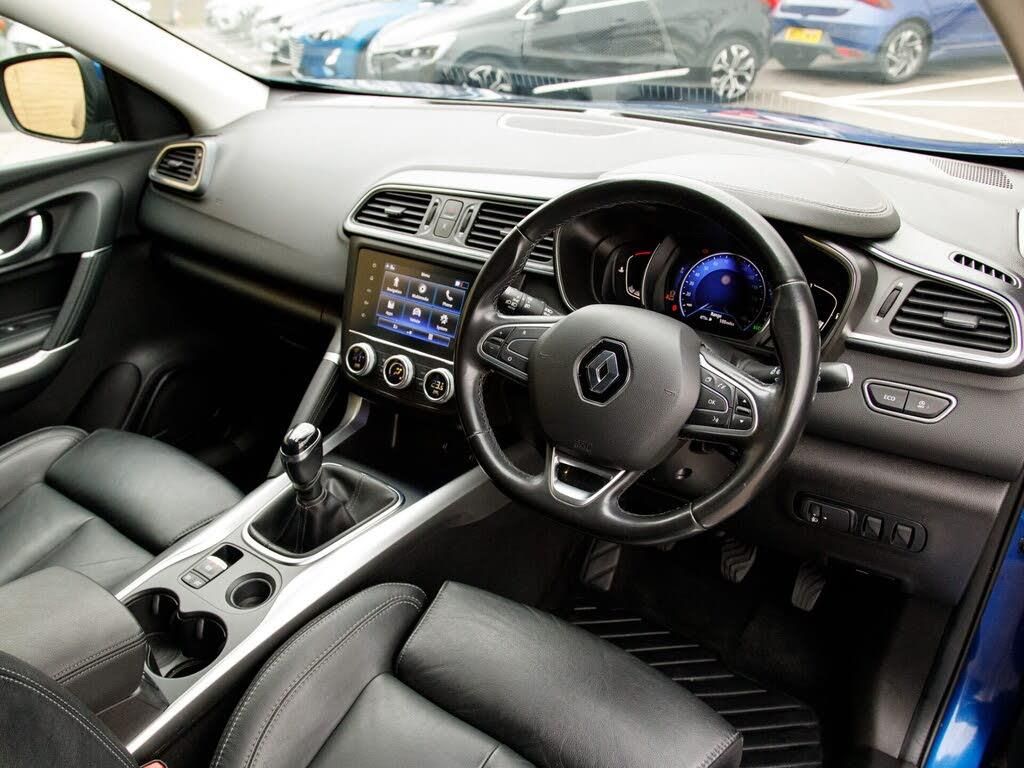 19in Alloy Wheels - Poseidon, 3 Height Adjustable Rear Head Restraints, 3 Point Inertia Reel Seatbelts, 3-Seat Rear Bench, 60-40 Split Folding Seats, ABS with EBA - Emergency Brake Assist, AEBS - Advanced Emergency Braking System, Accessory Power Point, Adamantium Grey Front and Rear Skid Plates, Adjustable dashboard illumination, Air Recirculation, Airbags - Curtain Front and Rear, Airbags - Deactivation of Front Passenger - For Use with Child Seats, Airbags - Driver and Passenger Adaptive Front, Airbags - Front Lateral, Apple CarPlay and Android Auto, Auto Dimming Rear View Mirror, Automatic Dual Zone Climate Control, Automatic Headlights and Front Wipers, BOSE Energy Efficient Sound System, Back-Illuminated Central Console, Blind spot warning, Body Sided Moulding with Chrome Insert, Central Rear Armrest with Cup Holders, Chrome Inserts on Front Grille, Chrome Window Surrounds, Courtesy Lights - Rear, Cruise control with speed limiter, Daytime Running Lights - LED, Deadlocking and Immobiliser, Display - Digital Speedometer, Door Handles - Body Coloured - Front, Door Mirrors - Body Coloured, Door Mirrors - Heated and Electrically Adjustable - Automatically Folding, Door-Boot Open Warning Light, Driver Seat Belt Height Adjustable, Driver and Passenger Seat Belt Undone Warning Audible Alert, ESP - Electronic Stability Programme with ASR - Anti-Skid Regulation and UCL - Understeer Logic Control, Easylife Quick Folding Rear Seats, Eco mode, Electric front windows, Electric rear windows, Electronic Parking Brake, Exterior Temperature Indicator, Extra Tinted Windows - Rear and Tailgate, Fingertip Audio System Remote Control, Fixed Glass Panoramic Sunroof, Flank Protection, Floor Mats - Front and Rear, Fog Lights - Chrome Surrounds, Full LED Headlamps, Gear change indicator, HSA - Hill Start Assist, Hands Free Parking, Headlights - Automatic High-Low Beam, Headrests - Front Fully Adjustable, Heated Front Seats and Electrically Adjustable Drivers Seat - Fore-aft - Height and Recline, Heated rear windscreen, Height Adjustable Front Seat Belts, ISOFIX Child Seat Anchorage on Rear Outer Seats, Insurance Approved - Category 1 Alarm System and Immobiliser, Integrated C-Shape Indicators with Side Repeaters, Interior Courtesy Light Controlled By All 4 Doors, Iron Blue, Keycard - Hands Free with Walk Away Lock Function, Kick Plates - Side and Boot, LDW - Lane Departure Warning, LED Front Fog Lights with Cornering Lights, LED Tail Lights, Leather - Carbon Black, Leather steering wheel, Low fuel level warning light, Luggage Compartment - Illumination, Multi Position Boot Floor, Oil level gauge, Parking Sensors - Front and Rear, Pollen filter, Power Steering, Protective Rear Brake Disc, Puddle Lighting in Door Mirrors, R-Link 2 Multimedia System - 7in Touchscreen, RAID - Renault Anti Intruder Device - Auto Closure - 6mph, Reading Lights - Driver and Front Passenger, Rear air vents, Rear LED Fog Lights, Rear parking camera, Rear Seat Belt Undone Audible Alert, Rev-Counter, Roof rails, Seats - Driver and Passenger Cushion Length Extender, Seats - Drivers Height and Lumbar Adjustment, Seats - Height Adjustable Front Seatbelts with Double Pretensioners, Seats - Passenger Height Adjustment, Side Impact Protection Bars, Sliding Front Centre Armrest, Smart Phone Integration, Speed Alert with Traffic Sign Recognition, Steering Wheel - Rake and Reach Adjustable, Sun Visor - Mirror With Light, Trip Computer - Multifunctional, Two Rear USB Plugs, Tyre inflation kit, Tyre Pressure Monitoring System