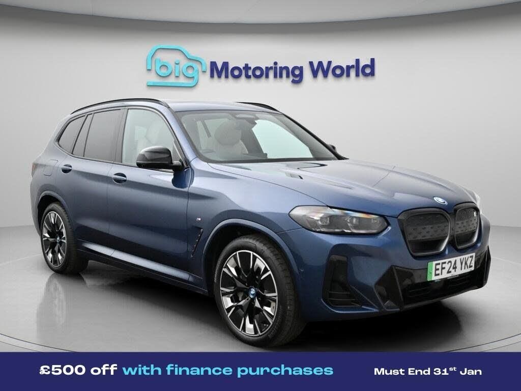 £500 towards your finance depo-Our BMW iX3 is finished in Blue. Specification includes a range of fantastic features including £500 towards your finance deposit, Sun Protection Pack, Head up Display, 20'' Alloy Wheels, Leather Seats, Adaptive Cruise Control, Electric Seats, Harman Kardon Speakers, Electric Panoramic Roof, M Sport Bodykit Specification information is supplied by CAPHPI and may vary to the actual car. This data does not form any part of a buying contact. Please check specification prior to purchase in-store. The MOT is valid until June 2027, visit bigmotoringworld.co.uk for more photos, a 360 tour, service history and a free HPI report.Were BIG on peace of mind and this Blue BMW iX3 has completed our comprehensive 200 point inspection and passed all checks. Its ready for you to drive away with immediate collection in-store. We include a 90-day warranty as standard plus an option to extend for up to 3 years.Reserve this car exclusively for you, safely and securely at bigmotoringworld.co.uk, with a fully refundable £99 deposit. Test drive before you buy, with no commitment, no hassle and a completely haggle free experience. Still searching and want to see thousands more cars? We are BIG on choice with over 8000 cars to choose from.Visit our award winning web site bigmotoringworld.co.uk.Were Big Motoring World and were BIG on what matters to you.