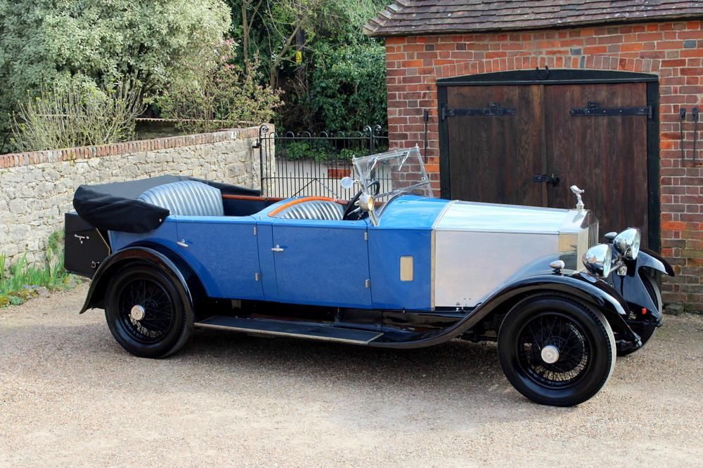 1929 Rolls-Royce 20/25 Open Tourer with coachwork by Barker. Registration number JSU199, chassis number. GX08, engine number EE6A. This splendid early 20/25 was first commissioned on 21st November 1929 with chassis GVO79 which was a 20HP chassis from stores which weas updated by the factory to the latest 20/25 specification including being converted from small to large bore cylinders and chassis plates were changed to GXO87- being in the first 100 20/25 models to be built. The chassis was sold to Lt. Col. James of Penzance, Cornwall who commissioned Barker & Co coachbuilders to construct a torpedo open tourer body for it. Like many Pre-War Rolls-Royce’s, the car ended up in the USA in the 1960’s and the body was modified to ‘shooting brake’ style utilising the original Barker front end. Upon its return to England in 1987 it was put back to its original Barker open tourer specification utilising as much of the original body as possible. It is believed that £93,000 was spent on the restoration, the quality of which is still evident today. The stylish Blue open tourer coachwork has very attractive lines which suites the chassis perfectly. It exemplifies all the qualities that Henry Royce envisaged for a light body 20/25, with light steering, smooth gearbox and sprightly performance unhindered by heavy, formal coachwork. In recent years the car has been used for numerous European rallies and has been maintained to an extremely high standard. The interior is trimmed in Blue leather with folding rear picnic table, removable side screens and Barker Patent dipping headlights. It also has a removable touring trunk and various tools. Offered with an impressive history file which details the cars careful maintenance which over 35 years of invoices and paperwork. On the road the car performs extremely well and it’s a pleasure to drive. Perfect for showing and touring.