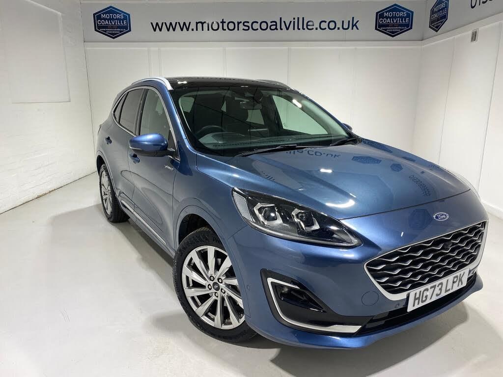 2024 73 Reg Ford Kuga 2.5 FHEV (190PS) Automatic VIGNALE 5dr. Chrome Blue with Ebony quilted FULL LEATHER interior, 19 inch alloy wheels, OPENABLE PANORAMIC ROOF, DRIVER ASSISTANCE PACK with ADAPTIVE CRUISE CONTROL, TRAFFIC SIGN RECOGNITION, BLIND SPOT INFORMATION with PARK OUT ASSIST, DOOR EDGE GUARDS, ACTIVE PARK ASSIST and FRONT AND REAR CAMERA, TECHNOLOGY PACK with FULL LED HEADLIGHTS GLARE FREE and HEAD UP DISPLAY, ROOF RAILS and PRIVACY GLASS, SYNC3 TOUCHSCREEN SATELLITE NAVIGATION, SONY premium audio system with subwoofer, Bluetooth USB, DAB, Apple CarPlay and Android Auto, drivers 10 way electrically operated seat with memory, HEATED FRONT SEATS, DUAL ZONE CLIMATE CONTROL AIR CON, cruise control with speed limiter, ACTIVE PARK ASSIST with FRONT AND REAR PARKING SENSORS, REAR CAMERA, FOOT OPERATED POWER TAILGATE, electrically operated, heated and power folding mirrors, auto lights, rain sensing wipers, quickclear heated windscreen, keyless entry and power start button, roof rails, XENON headlights, ESP, ABS, 21,419 miles (HG 73 LPK).