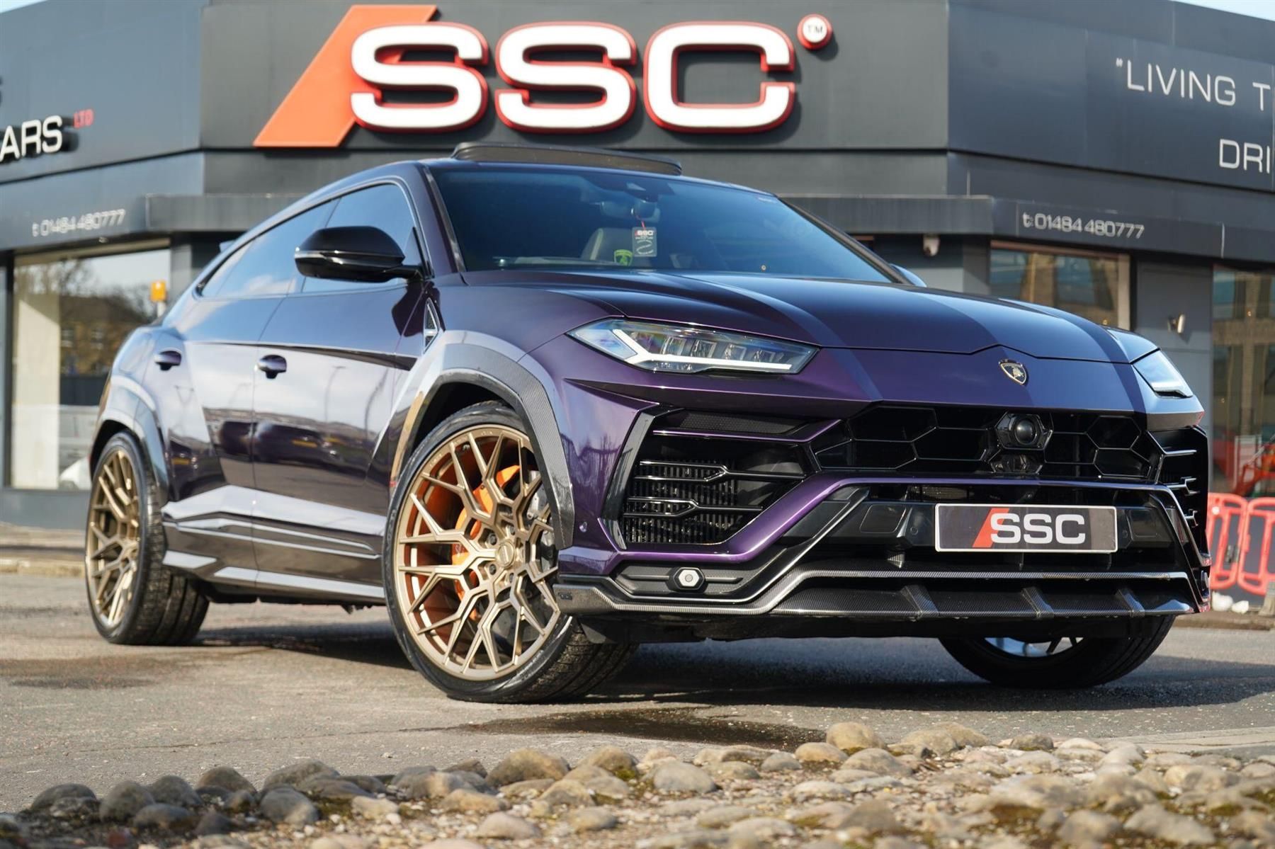 Stunning Urus V8 SUV Professionally Wrapped In Inozetek Super Gloss Metallic Midnight Purple With Nero Ade Unicolor Sportivo Leather. Fantastic Spec Inc: Full URBAN Carbon Exterior Programme, 24'' Urban Alloys In Gold, Panoramic Sunroof, Ventilated Front Seats With Massage and Memory, Heated Rear Seats, Bang & Olufsen 3D Advanced Sound System, Ambient Lighting, DAB, 3D Surround Cameras, Parking Assistance, ADAS Pack, Head Up Display, Lane Assist, Blind Spot Assist, Adaptive Cruise Control, Ceramic Brakes With Orange Calipers, Optional Stitching, Q-Citura Stitching On Leather, Optional Stitching On Steering Wheel, Heated Smooth Leather Steering Wheel, Privacy Glass, Offroad Modes, Alcantara Headliner, Embroidered Shields On Headrests. Originally Finished In Grigio Lynx. This Urus Comes With Full Lamborghini Service History and 12 Months Lamborghini Extended Warranty.