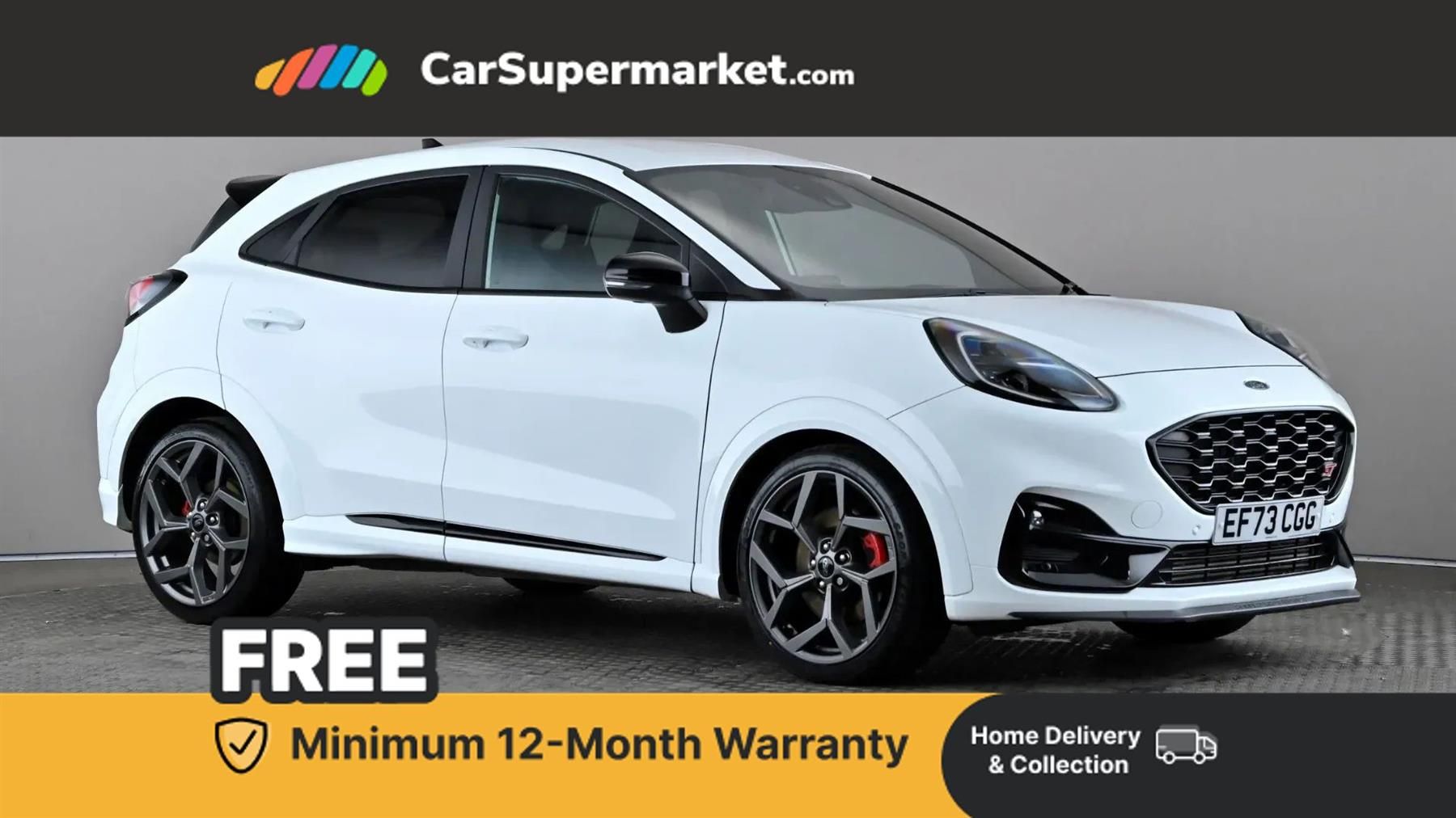 Cruise control with Intelligent speed assist,Driver impairment monitor,Emergency call service,Ford easy fuel,Front and rear parking sensors,Full digital 12.3" instrument cluster,Lane keeping aid with lane departure warning,Power assist steering,Selectable drive modes (normal, sport, eco, track),Speed sign recognition,Engine sound enhancer,ST suspension,Automatic headlights with auto high beam,Automatic rain sensing wipers,Dual chrome exhaust,Fixed LED signature headlamps,Front fog lamps,LED daytime running lights,LED rear lamps,Power foldable heated door mirrors with puddle lamps and puma logo protection,Privacy glass to side rear windows and tailgate glass,Quickclear heated windscreen,Rear side wing doors,Rear wiper,ST scuff plates,Third brake light,Unique ST body styling kit including wing mirrors and Ford Performance embossed splitter,3 seat bench in 2nd row,Alloy sports pedals,Centre console with armrest and stowage,Ford megabox extended bootspace,Ford Performance sensico partial premium leather upholstery with metal grey stitching,Front and rear head restraints,Manual 6 way driver seat adjust with lumbar adjustment,Manual 6 way passenger seat with lumbar seat adjustment,Single front passenger seat,ST flat bottomed steering wheel with metal grey stitching,ST logo projection,Unique ST gear shift knob,Wireless charging pad with electronic air temperature control (EATC),B&O Premium Audio system + Ford SYNC 3 navigation pack - Puma,Winter pack - Puma,3 rear seatbelts,Child safety lock,Electronic stability control (ESC) and hill start assist,Pedestrian/cyclist detection & post-collision braking,Pre collision assist system,Red brake calipers,Tyre pressure monitoring system (TPMS),Keyless entry and power start button,Thatcham alarm,Carbon look interior deco spears,19" 5 Spoke magnetite dark finished alloy wheel,Tyre inflation kit,Frozen White