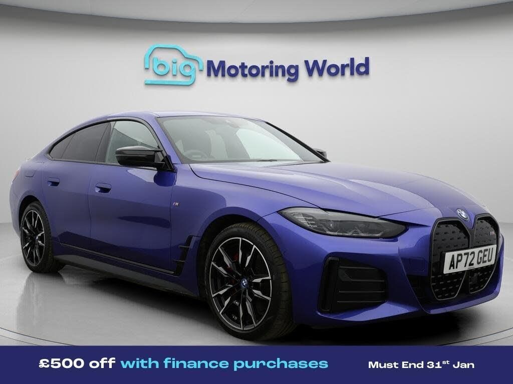 £500 towards your finance depo-Our BMW i4 comes with optional extras worth £4,565. Specification includes a range of fantastic features including £500 towards your finance deposit, All Wheel Drive, Sun Protection Pack, Head up Display, Leather Seats, Apple CarPlay, Adaptive Cruise Control, Electric Seats, Harman Kardon Speakers, Electric Panoramic Roof Specification information is supplied by CAPHPI and may vary to the actual car. This data does not form any part of a buying contact. Please check specification prior to purchase in-store. The MOT is valid until December 2026, visit bigmotoringworld.co.uk for more photos, a 360 tour, service history and a free HPI report.Were BIG on peace of mind and this Blue BMW i4 has completed our comprehensive 200 point inspection and passed all checks. Its ready for you to drive away with immediate collection in-store. We include a 90-day warranty as standard plus an option to extend for up to 3 years.Reserve this car exclusively for you, safely and securely at bigmotoringworld.co.uk, with a fully refundable £99 deposit. Test drive before you buy, with no commitment, no hassle and a completely haggle free experience. Still searching and want to see thousands more cars? We are BIG on choice with over 8000 cars to choose from.Visit our award winning web site bigmotoringworld.co.uk.Were Big Motoring World and were BIG on what matters to you.