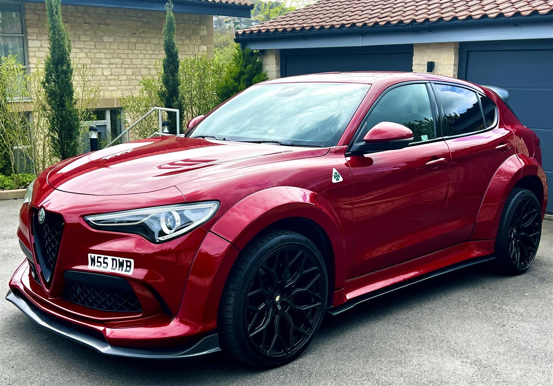 One of One 2018 / 68 Alfa Romeo Stelvio Deranged Widebody. This was created in 2018 by Deranged of Essex who specialise in customising Pick Ups, and they created this as a promotional marketing vehicle. It started as a standard Quadrifoglio and the wide body kit, double rear spoilers, side spoilers and front diffuser were fitted. The wide body kit was professionally painted to match the stunning Competizione Red (£2,250), and the other spoilers are finished in matt carbon fibre. These are complimented by 22" black multispoke Vossen alloy wheels and custom tri-colour brakes. The vehicle has real presence and gets attention wherever it goes. The Stelvio 2.9 V6 Bi-Turbo Quadrifoglio embodies the pinnacle of Alfa's performance engineering, blending supercar-bred power with everyday SUV practicality. Quad exhaust tips, black window surrounds, and Bi-Xenon AFS headlights creating a stance that is unmistakably Alfa. Inside, motorsport heritage continues with Leather-Alcantara sports seating, carbon-fibre interior inserts, black leather-wrapped dashboard, and the optional Quadrifoglio flat-bottomed steering wheel with carbon insert (£425.00), complete with the iconic red start button. Advanced performance systems, Alfa DNA Pro with Race Mode, Active Torque Vectoring, Active Suspension, CDC chassis control, Integrated Braking System, and Q4 all-wheel drive, unlock the full potential of its 510ps V6, delivering razor-sharp dynamics and extraordinary grip. Technology is equally sophisticated, featuring the 8.8in Alfa Connect 3D navigation system, Apple CarPlay/Android Auto, ambient LED lighting, Blind Spot Monitoring, Front & Rear Parking Sensors, Rear Camera with dynamic lines, and Dual-Zone Climate Control.