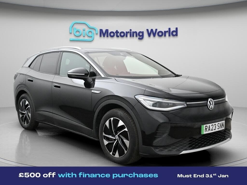 £500 towards your finance depo-Our Volkswagen ID.4 comes with optional extras worth £710. Specification includes a range of fantastic features including £500 towards your finance deposit, Panoramic Roof, Apple CarPlay, Adaptive Cruise Control, Privacy Glass, Heated Seats, Heated Steering Wheel, Internet, Bluetooth, Blind Spot Assist Specification information is supplied by CAPHPI and may vary to the actual car. This data does not form any part of a buying contact. Please check specification prior to purchase in-store. The MOT is valid until March 2027, visit bigmotoringworld.co.uk for more photos, a 360 tour, service history and a free HPI report.Were BIG on peace of mind and this Black Volkswagen ID.4 has completed our comprehensive 200 point inspection and passed all checks. Its ready for you to drive away with immediate collection in-store. We include a 90-day warranty as standard plus an option to extend for up to 3 years.Reserve this car exclusively for you, safely and securely at bigmotoringworld.co.uk, with a fully refundable £99 deposit. Test drive before you buy, with no commitment, no hassle and a completely haggle free experience. Still searching and want to see thousands more cars? We are BIG on choice with over 8000 cars to choose from.Visit our award winning web site bigmotoringworld.co.uk.Were Big Motoring World and were BIG on what matters to you.