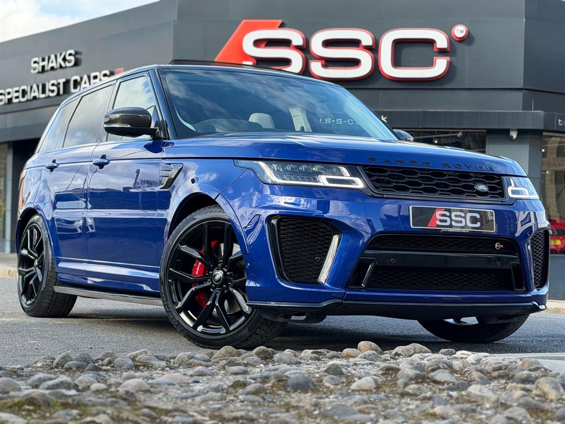Stunning SVR Finished In Estoril Blue With Two Tone Cirrus and Ebony Windsor Leather Interior. Fantastic Spec Inc: Ghost Immobiliser, Genuine SVR Carbon Upgrades - Carbon Mirrors, Carbon Rear Tailgate Trim, Carbon Fender Trims, Carbon Front Grill, Carbon SVR Steering Wheel Trim, Head Up Display, Fixed Side Steps, Panoramic Sliding Sunroof, Black Contrast Roof, 22'' Alloys In Black, Red Calipers, Electric Heated Front SVR Sports Seats With Memory, Heated Rear Seats, Meridian Surround Sound, Privacy Glass, Adaptive Dynamics, Dynamic Response, Tyre Pressure Monitoring System, Heated Steering Wheel, Navigation Pro, Touch Pro Duo, Keyless Entry, Electric Folding Mirrors With Memory, Emergency Braking, Lane Departure Warning, Rear View Camera, Adaptive Cruise Control, 360 Parking Aid, Clear Exit Monitor, Rear Traffic Monitor, Driver Condition Monitor, Traffic Sign Recognition and Adaptive Speed Limiter, Blind Spot Monitor, High-Speed Emergency Braking, Configurable Ambient Lighting, Extended Leather Upgrade. This SVR Comes With Full Land Rover Service History.
