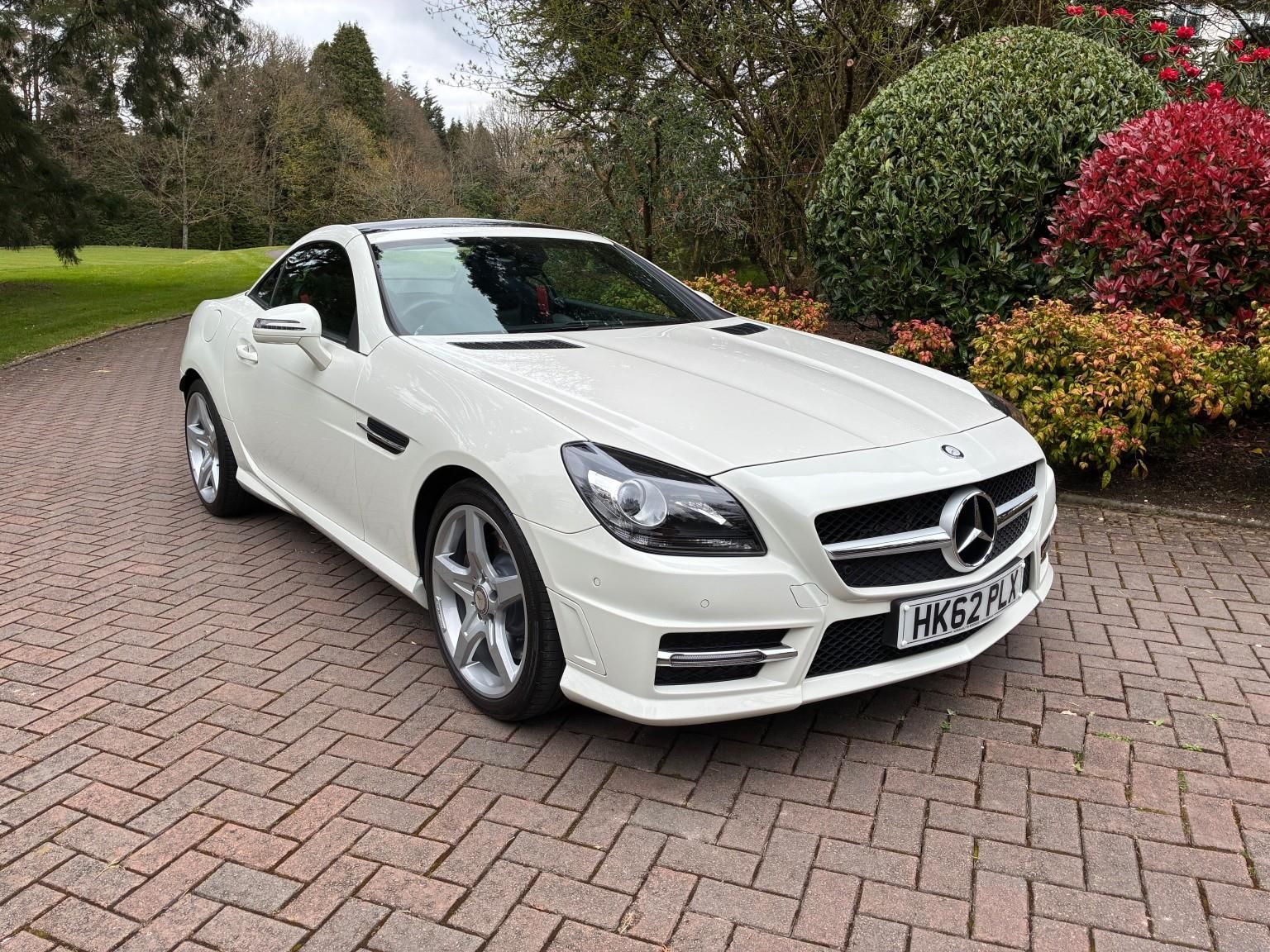 Calcite White with Black leather and Red seat belts. Only 17000 mls from new with Mercedes main dealer/specialist service history. Full specification includes: Full AMG Sport pack including AMG alloys and bodystyling, Glass roof,Heated seats, Air conditioning, Parktronic,Electric windows,Electric folding mirrors,DAB Radio,Bluetooth,Wind deflector and all usual refinements of this model. A quite exceptional ultra low mileage SLK supplied with all books/manuals,two keys and 12m MOT at point of sale.