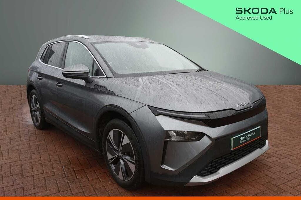 Exterior Features, Metallic paint, Interior Features, Dual zone climate control, Wheels, 19" Regulus Anthracite alloy wheels, Paint - Metallic, Metallic - Graphite grey, Trim - Cloth, Loft design pack - Grey fabric / black artificial leather with green stitching and anthracite glossy decor, Exterior Features, Heat insulating glass windscreen, Light and rain sensors, Privacy glass and acoustic side windows, Rear window wiper with washer system and intermittent control, Side and rear windows in heat insulating glass, Manually operated boot, Rear side wing doors, Rear spoiler, Unique dark chrome roof rails, Unique dark chrome window trim, LED 3rd brake light, LED headlights with LED daytime running lights and headlight range control, Light assistant including coming home and leaving function, Rear LED lights, Safety, ESC (incl. ABS+MSR+ASR+EDS+HBA+DSR+RBS+MKB), Front assist with braking reaction to vehicles, pedestrians and cyclists, Front disc brakes, Rear drum brakes, Blind spot detection, Drive mode select, Driver alert control, Electronic engine sound, Front parking sensors, Power assist steering, Predictive adaptive cruise control with traffic jam assist, Rear parking sensors, Rear view camera, Skoda Connect iV remote services with charging, air conditioning and smart schedules, Speed assist, Traffic sign recognition, Travel assist plus - emergency assist, lane assist plus with narrow lane assist, urban evasive steering support, Auto dimming door mirrors, Electric adjustable heated folding door mirrors with boarding spots and welcome logo, Frameless auto dimming rear view mirror, 3 point rear seatbelts, Crew protect assist, Driver and front passenger airbag with passenger airbag deactivation, Electric child locks, Front side airbags with curtain airbags and central interaction airbag, Three point seatbelt in front, with pretensioner, lap belt pretensioner and height adjustment, Two tone horn, Tyre pressure monitoring system, Visual and acoustic seat belt reminder, Audio / Communications, Bluetooth, Wi-Fi hotspot, 45W USB-C ports (charging + data) front and rear, 8 Speakers, DAB Digital radio, Driver Convenience, 15W wireless charging with cooling function, eCall emergency system, Manual tailgate, Voice control, Miscellaneous, 13" touchscreen display, Digital cockpit, Emergency steering support with turn assist, Gesture control, Satellite navigation system, Washer fluid level indicator, Wireless smartlink, Interior Features, 12V socket in boot, 1x umbrella, 2-spoke leather heated multi-function steering wheel with paddles for recuperation level selection, Extended interior noise suspension, Folding boot cover, Boot lighting, LED ambient lighting, Packs, Loft design pack - Elroq, Trim, 3 rear headrests, 3 seat bench in 2nd row, Front head restraints, Heated front seats, Isofix child seat fittings in outer rear seats with top tether, Isofix child seat preparation for front passenger seat, Manual lumbar support for front seats, Manually adjustable front seats, Single front passenger seat, Security, Anti theft alarm system with interior monitoring, backup horn and towing protection, Central locking system with SAFE system, Keyless entry and start/stop system advanced with walk away locking, Towing, Preparation for tow bar, Vehicle Charging, 175 kW DC charging, 6m mode 3 cable (32A), Wheels, Anti-theft wheel bolts protection, Tyre repair kit