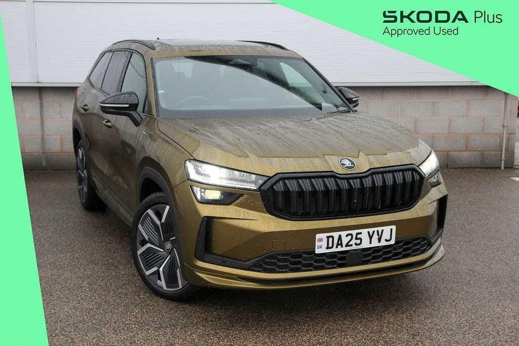 Metallic paint, Panoramic sunroof, Rear view camera, 3 spoke multi-function leather sports steering wheel with paddle shift, Variable boot floor, Head up Display, Convenience plus pack - Kodiaq SE L/Sport Line/vRS, Heated front seats, Metallic - Bronx gold, SportLine design selection - Perforated/Artificial leather - Black, Aero front windscreen wipers with intermittent function, Electric front and rear windows, Heat insulating glass in windshield, Heated rear window, Privacy glass, Rear window wiper, Windscreen wipers with rain sensor, Black diffuser and decorative tailpipe with a unique dark chrome finish, Black roof rails, Black sports styling including front grille and window surrounds, Black wheel arch surrounds, Body colour door handles, Exterior black decorative trims, Front and rear sports bumpers including lower rear chrome strip, Gloss black window frame and D pillar, Ice scraper in fuel tank cap, Rear roof spoiler, Rear side wing doors, Safety reflectors on front and rear doors, Sportline badge on front fenders, Tailgate lettering in Black, Unique dark chrome design logo on alloy wheels, Window control switches with black trim, Without engine designation, AWL (all weather lighting) and all weather light with cornering function, Cornering light and poor weather light, LED daytime running lights, LED third brake light in rear spoiler, Light assistant with automatic headlight control and coming home feature, Red decorative strip between rear LED lights, Electronic parking brake, ESC (incl. ABS+EMD+MSR+ASR+EDL+HBA+DSR+RBS+ESBS+MCB+TSA+XDS), Front assist with braking reaction to vehicles, pedestrians and cyclists, Front disc brakes, Hill hold assist, Junction assist with automatic emergency braking, Rear disc brakes, Blind spot detection with door exit warning, Driver alert - Fatigue and drowsiness monitor, Front and rear parking sensors, Front cross traffic assist, Lane assist, PAS, Rear traffic assist, Traffic sign recognition, Auto dimming rear view mirror, Electric folding /adjustable/separted heated/folding door mirrors, auto dimming with boarding sports and memory function, Gloss black door mirrors, Logo projection in door mirrors, Auto door release and activation of warning lights in the event of an accident, Driver and front passenger airbag with knee airbag and front passenger airbag deactivation, Electric child locks, Fuel cut off safety device, Height adjustable front 3 point seatbelts + pretensioners, Safety vest holder in door, Seat belt reminder for all seats, Three point rear seat belts, Two tone horn, Tyre pressure monitor, Front and rear floor mats, Pollen filter, Tri zone climate control, 1.5l bottle holder points in all door, 3 configurable smart dials with 32mm coloured display, 4 foldable roof handles with rear coat hooks, Aluminium pedals, Automatic gear selector on steering column, Chrome interior door handles, Fabric headlining, Front centre armrest with jumbo box storage compartment, cup holder and 12V socket, Interior black decorative trims, Manually adjustable steering column, Rear centre armrest with cupholders, Skoda lettering on steering wheel, Storage pocket including mobile phone pockets on the backs of the front seats, Ticket holder on A Pillar, Umbrella in door panel x1 made from sustainable materials, USB C port by rear view mirror for charging only (15W), 1x centre rear reading light, Ambient interior lighting - Dashboard, front-door stowage compartments, front and rear door panels and footwell lighting, Driver/front passenger reading lights, Upper and lower glovebox with card holder and coin compartment, Sunvisors with illuminated vanity mirrors, Bluetooth system, Emergency call, Voice control system, Wireless charging for two smartphones (15W) with cooling function, 2x USB-C in the rear, DAB Digital radio, Tailgate unlocking from outside, 13'' satellite navigation touchscreen display, ChatGPT functionality, Dry display cleaner, USB C Port x 2 in front centre console, Virtual Cockpit -