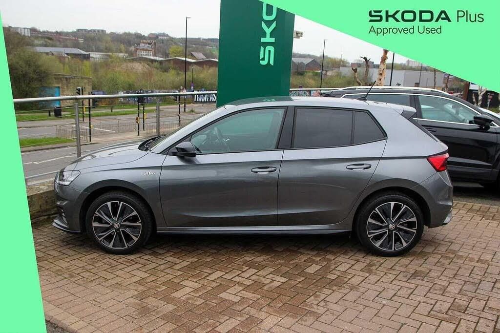 Metallic paint, Metallic - Graphite grey, Front and rear electric windows, Front window wiper intermittent control, Privacy glass, Rear window wiper with washing nozzles, Black radiator grille, Body coloured bumpers, Ice scraper in fuel cap, Monte Carlo badging, Rear side wing doors, Roof mounted spoiler, SKODA tailgate lettering in black, Sports bumpers, Basic rear lights, Headlight range control - Automatic, LED daytime running lights with coming and leaving home feature, Rear LED fog light, Third brake light, ESC including ABS, MSR, ASR, EDS, HBA and XDS, FRONT ASSIST (AEB City and AEB Inter Urban), Driver alert system - DAS, Electromechanical power steering, Auto dimming rear view mirror, Door mirror integrated indicators, Electrically adjustable and heated door mirrors, 3-point height adjustable front seats belts with pretensioner and force limiter, Automatic warning lights in case of crash, Driver and passengers airbag with switch off function, e-Call+, Front and rear seat belt warning, Front side airbags, Head airbags, One tone horn, Pedestrian protection, Three rear 3-points safety seat belts with pretensioner and force limiter including stop function for outer rear seat belts, Tyre pressure monitoring system, Textile floor mats, Pollen filter, Aluminium pedals, Black headlining, Central console with removable cup holder and storage box, Chrome handbrake release button, Fabric/artificial leather upholstery, Gearshift knob/handle in leather, Hand brake lever handle in leather, Height adjustable steering wheel, Metallic painted red central console cover, Metallic red interior door handles, Monte Carlo door sills, Ticket holder, Umbrella in drivers door, Luggage compartment lighting, Sun visors with mirror and airbag label on passenger side, Bluetooth connection, 2x USB-C in the front (for data transmission and charging), 6 Speakers (4 in front and 2 in rear), Auxiliary socket for external MP3 player, Bolero radio with 8'' colour display, DAB digital radio reception, Exterior temperature gauge, Service interval indicator, Carbon effect door and side trim panels, Carbon effect lower decorative trim with white stitching, Red metallic upper decorative trim, 3 rear headrests, Backrest split and folding, Front sports seats, Height adjustable front headrests, ISOFIX and TopTether anchorage points to the outer rear seats, ISOFIX and TopTether on the front passenger seat, Rear seat bench unsplit, Single front passenger seat, Ambient lighting pack 2 - Fabia Hatchback, Anti-theft alarm system including immobiliser, interior monitoring, backup horn, and towing protection, Anti-theft wheel bolts protection, Super-low rolling resistance tyres