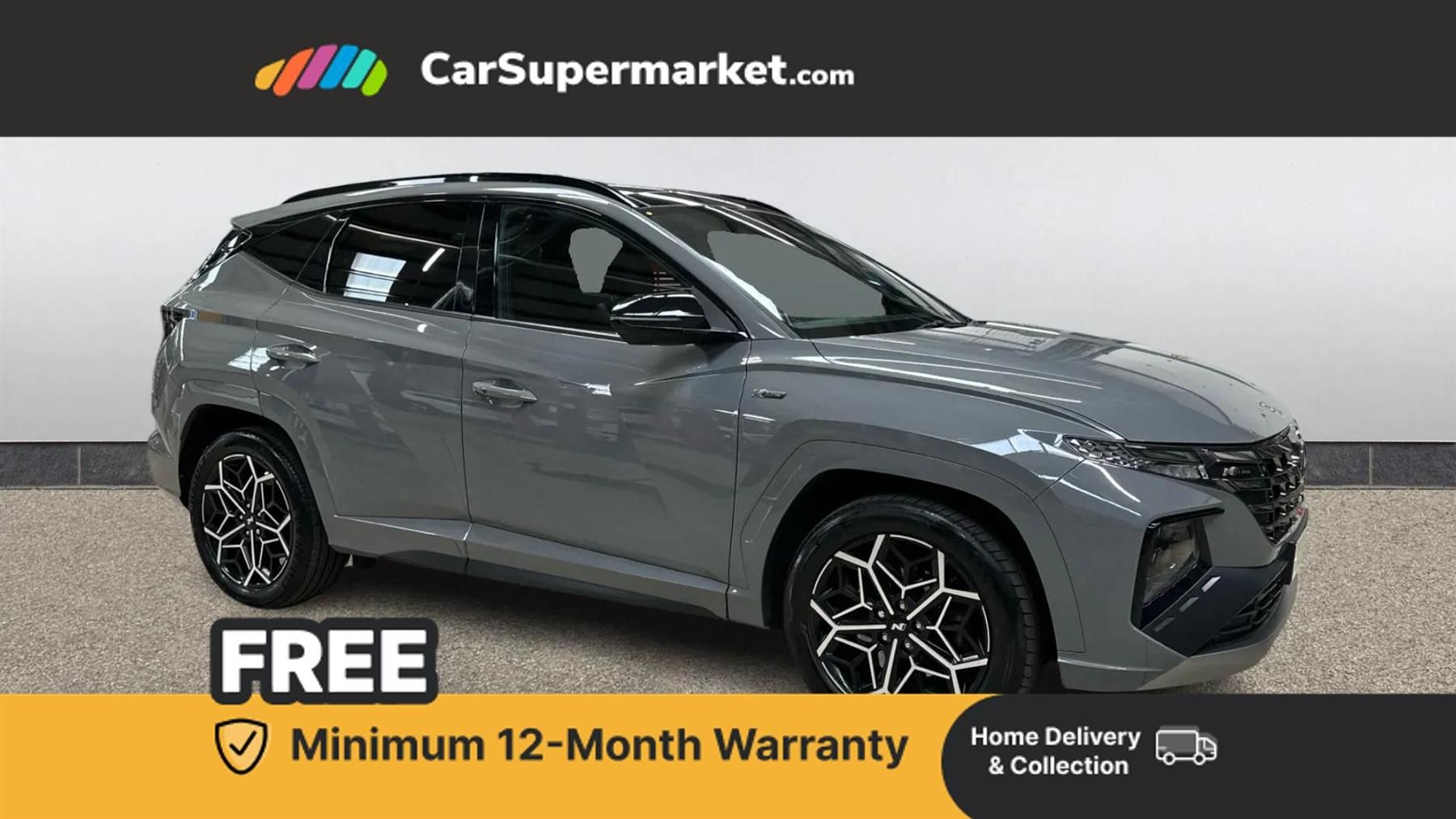 Sat Nav, Android Auto, Apple CarPlay, Blind Spot Monitoring, Bluetooth, Cruise Control, Parking Sensors, Rear View Camera, Digital Radio, Privacy Glass, Heated Front Seats, Heated Steering Wheel, Keyless Entry;This Hyundai Tucson N Line in Grey features standard specification. Highlights include Sat Nav, Android Auto, Apple CarPlay, Blind Spot Monitoring, Bluetooth, Cruise Control, Parking Sensors, Rear View Camera, Digital Radio, Privacy Glass, Heated Front Seats, Heated Steering Wheel, and Keyless Entry. Optional extras include Shadow Grey Solid paint. Options cost £700. Comes with a minimum 12-month warranty, offering a sporty hybrid SUV with advanced technology.