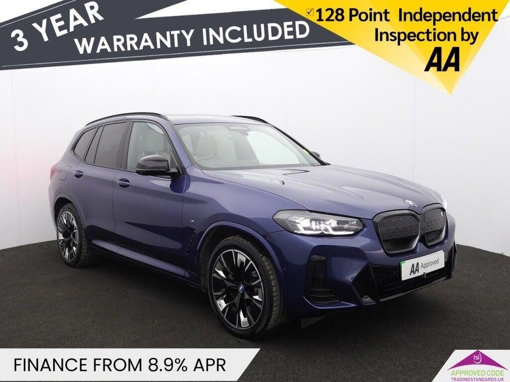 20in Alloy Wheels - M Aerodynamic - Bi-Colour, ABS - Anti Lock Braking System, Acoustic Glazing, Active Guard Plus, Active Protection, Adaptive LED Headlights, Adaptive Suspension, Air Breather with BMW M logo, Air Conditioning - Automatic, Airbags - Driver and Front Passenger, Airbags - Front Side for Driver and Passenger, Airbags - Head - Front and Rear, Alarm System, Ambient Lighting, Armrests, Attentiveness Assistant, Automatic Operation of Tailgate, Automatic Start-Stop Button, Backrest Width Adjustment for Driver, Blue Ring Around BMW Logos, BMW Connected Package Professional, BMW ConnectedDrive Online Services, BMW Gesture Control, BMW Iconic Sounds - Electric, BMW iDrive, BMW Individual Lights - Shadowline, BMW Legal Emergency Call, BMW Live Cockpit Professional, BMW TeleServices, Brake Pad Wear Indicator, Bumper System Front and Rear - Replaceable Deformation Elements for Impacts Up to 15kmh, CBC - Cornering Brake Control, Centre Lock Switch, Charging Cable - Mode 3 - 5m, Closing System with Central Locking, Comfort Access, Condition Based Service, Crash Sensor, Cup Holders - Front x2, DAB Digital Radio, Door Sill Strips, Drive Recorder, Driving Assistant Professional, Driving Experience Switch, DSC - Dynamic Stability Control Plus, DTC - Dynamic Traction Control, Dynamic Brake Lights, eDrive Exterior Sound, Electric Memory Seats, Electric Windows - Front, Electro Mechanical Parking Brake, Electronic Vehicle Immobiliser, Enhanced Bluetooth with Wireless Charging, Extended Storage, Exterior Mirrors - Electrically Folding with Anti Dazzle, Exterior Trim - Extended High Gloss Shadowline, Exterior Trim - High-Gloss Shadowline, Floor Mats - Velour, Follow Me Home Headlight Function, Front and Rear Parking Sensors, Front Bumper - M Sport with iX3 Specific Design with Blue Contents, Galvanic Embellisher for Controls, Glove Compartment - Lockable, Head-Up Display, Headlights - Beam Throw Control, Headlining - M Anthracite, Heated Seats for Driver and Front Passenger, Heated Steering Wheel, High-Beam Assistant, Instrument Panel in Sensatec, Interior Rear-View Mirror with Automatic Anti-Dazzle Function, Interior Trim - Aluminium Rhombicle with Pearl Chrome, Lashing Eyes in Luggage Compartment, Loudspeaker System - Harman Kardon, Luggage Compartment Lights, Luggage Net, Lumbar Support - Drivers, M Aerodynamic Exterior, M Badging on Front Side - Left and Right, M Seat Belts, M Sport Leather Steering Wheel, Multiple-Control-Arm Rear Axle, Non Smoker Package, Panoramic Glass Sunroof, Parking Assistant, Parking Assistant Plus, Phytonic Blue, Power Sockets, Power Steering - Electric, Preparation for Adaptive M Suspension, Rain Sensor with Automatic Headlight Activation, Rear Centre Armrest including Two Cupholders, Rear Diffuser in Blue, Reversing Assist Camera, Reversing Light, Roof Rails - Shadow Line High Gloss - Black, Runflat Indicator, Safety Battery - Terminal Clamp, Seat Backrest Adjustment for Rear Seats, Seats - Front Sports, Servotronic Steering, Side Impact Protection, Split Folding Rear Seat, Steering Column Adjustment, Storage Options, Sun Protection Glass, Sun Visors with Vanity Mirrors and Ticket Holder, Third Brake Light Using LED Technology, TPMS - Tyre Pressure Monitoring System, Tyre Repair Kit, Vernasca Leather - Oyster with Grey Contrast Stitching, Warning Triangle, Washer Jets - Heated, Welcome Lighting, Widescreen Display, WiFi Hotspot