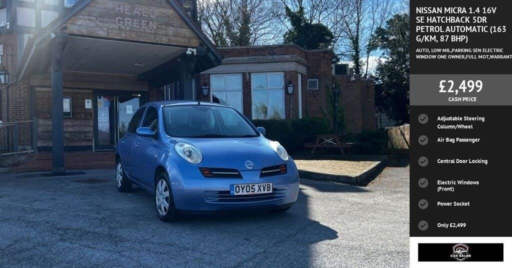 This Nissan Micra SE from 2005 offers excellent peace of mind with a clear vehicle history and only two previous owners. Powered by a reliable 1.4 litre petrol engine, this SE trim model is presented with a full 12 months MOT and a 1 month warranty for your confidence. This Micra SE is a smart choice, particularly for those mindful of running costs, as it sits in a low insurance group. The combination of its well maintained history, limited ownership, and included warranty and MOT make this a particularly appealing and sensible option. DELIVERY AVE FINANCE AVE SUPER RELIABEL AUTOMATIC CAR WITH LOW MIL AND MUCH MORE LIKE Adjustable Steering Column/Wheel, Air Bag Driver, Air Bag Passenger, Air Bag Side, Air Conditioning, Anti-Lock Brakes, Body Coloured Bumpers, Central Door Locking, Centre Rear Seat Belt, Clever Pack, Computer (Driver Information System), Deadlocks, Electric Windows (Front), Head Restraints, Immobiliser, In Car Entertainment (Single CD Player), Mirrors External, Power Socket, Power-Assisted Steering, Seat Height Adjustment, Seat Lumbar Support, Speakers, Steering Wheel Mounted Controls (Audio), Upholstery Cloth/Leather