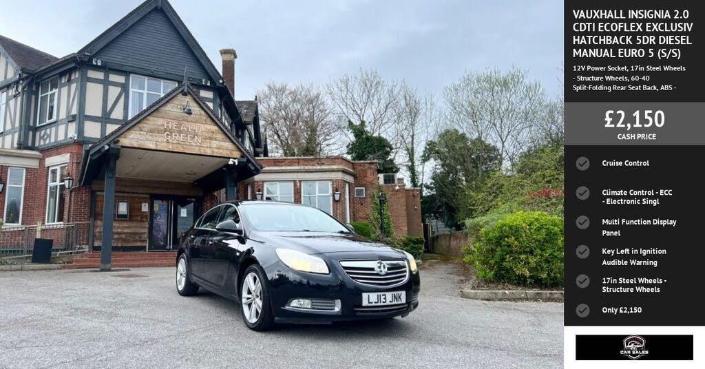 This Vauxhall Insignia CDTi Exclusiv from 2013 boasts a recent service in March 2026 at 107,500 miles, ensuring its continued reliability. This model features a 2.0 litre diesel engine and comes with a 1 month warranty for your peace of mind. A clear vehicle history check confirms its good standing, and it will be supplied with 12 months MOT upon purchase. Inside, you'll find convenient features such as Automatic Lighting Control, which includes automatic headlights, Electronic Single Zone Climate Control for your comfort, and a USB connection located within the centre armrest. The Insignia CDTi Exclusiv is also noted for its low insurance group, making it a more economical choice to own and run compared to many other vehicles. This, combined with its comprehensive service history and included warranty, demonstrates its excellent value and readiness for its next owner. DELIVERY AVE FINANCE AVE 12V Power Socket, 17in Steel Wheels - Structure Wheels, 60-40 Split-Folding Rear Seat Back, ABS - Anti-Lock Braking System, Adaptive Brake Lights, Air Recirculation System, Airbags - Deactivation Switch For Front Passengers, Airbags - Front Passenger Dual Stage, Airbags - Front Seat Side-Impact, Armrest - Front Centre with Storage Facility, Automatic Lighting Control, CBC - Cornering Brake Control, CD Player - CD400 with MP3 Compatability and Aux In, Centre Brake Light - LED, Chrome Effect Exterior Side Window Surround, Climate Control - ECC - Electronic Single Zone, Cruise Control, Daytime Running Lights, Door Mirrors - Electrically Adjustable-Heated, Drinks Holder - Rear Passengers Armrest, Drivers Dual-Stage Airbag, EBA - Emergency Brake Assist, EBD - Electronic Brakeforce Distribution, EPB - Electric Parking Brake, ESP - Electronic Stability Programme, Electric Windows - Front with Drivers Safety Autoreverse and One Touch Facility, Electronic Engine Deadlo