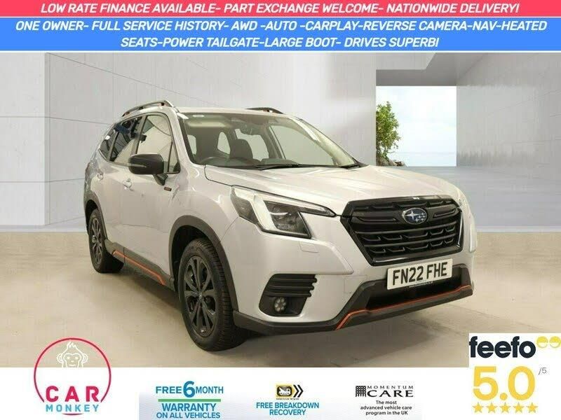 This 2022 Subaru Forester i e-Boxer XE Premium boasts a full service history and has had only one owner, offering excellent provenance. This Euro 6 compliant, four wheel drive vehicle features a 2.0 litre petrol hybrid engine, providing an efficient and capable driving experience. The XE Premium trim level ensures a well equipped interior, complete with dual zone automatic air conditioning with an anti dust filter, heated front seats for comfort in all conditions, and seamless smartphone integration through Apple CarPlay and Android Auto.Further enhancing its appeal, this Subaru Forester includes a reversing camera with parking assistance, making manoeuvring easier. The generous boot space is ideal for families, luggage, or outdoor gear, highlighting its practicality. With a 6 month warranty and a 12 month MOT provided on purchase, this vehicle offers peace of mind and represents a well maintained example of the versatile Forester model. This car will come supplied with MOT, Service and a comprehensive warranty included! Low rate finance available, Best prices given for part exchanges and nationwide delivery available! Call us to reserve today!