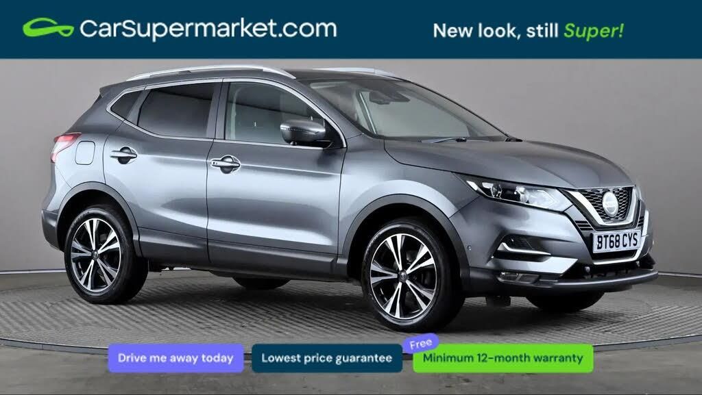 Advanced drive assist display 5'' TFT coloured screen,Bluetooth phone integration system,Cruise control + speed limiter,Electric speed sensitive power steering,Front parking sensors,Intelligent around view monitor,Intelligent parking assist,Lane departure warning system,Nissan connect evo 7" touchscreen navigation and entertainment system,Outside temperature sensor,Push button starter,Rear parking sensors,Rear view camera,Selectable steering,Service interval indicator,Smartphone integration,Stop/start system,Traffic sign recognition,Trip computer,Nissan chassis control (intelligent ride control, intelligent trace control, intelligent engine brake),6 speakers,Aux-in socket,DAB Digital radio,Radio/CD,Steering wheel mounted audio controls,USB port,Anti dazzle rear view mirror,Auto wipers,Body colour bumpers,Body colour door handles,Body colour door mirrors,Chrome window surround,Daytime running lights dip function when turn signal applied,Electric folding door mirrors,Electric front and rear windows with one touch illuminated window controls,Electric front/rear windows,Electrically adjustable door mirrors,Front fog lights,Halogen headlights,Heated door mirrors,High beam assist,Intelligent auto headlights,LED indicators in door mirrors,Matt silver roof rails,Privacy glass,Rear roof spoiler,Rear wiper,Shark fin antenna,Underbody vortex generators,2 X front 12v power sockets,3 height adjustable rear headrests,60/40 split folding rear seat,Ambient interior lighting,Boot light,Centre console storage box/armrest,Chrome interior door handles,Cloth upholstery,Configurable luggage board system,Driver's seat manual height adjust,Dual zone climate control,Front and rear door pockets with bottle holders,Front and rear seat belt pre-tensioners with load limiters,Front headrests,Height adjustable front headrests,Leather D shaped steering wheel,Leather gear lever,Leather knee pad,Manual height adjustable front passenger seat,Manual lumbar support on driver seat,Manual lumbar support on passenger seat,Monoform front seats with plastic backboard,Parcel shelf stow function under luggage board,Pollen filter,Rear armrest with 2 cupholders,Rear headrests,Synthetic leather wrapped door handle with contrasting stitching,Tilt/telescopic adjustable steering wheel,Safety shield plus pack - Qashqai,6 airbags - Driver, front passenger, curtain and side airbags,ABS, ESP, EBD and brake assist,Auto hold function,Child locks on rear doors,Electronic parking brake,Front and rear seat belt warning,Front passenger airbag deactivation,Height adjustable front seatbelts,Hill start assist,Intelligent emergency braking with pedestrian recognition,Three 3 point rear seatbelts,Tyre pressure monitoring system,Anti-theft immobiliser,Intelligent Key,Remote central locking,Thatcham Cat.1 alarm,Carbon graphite dash trim,Tyre puncture repair kit