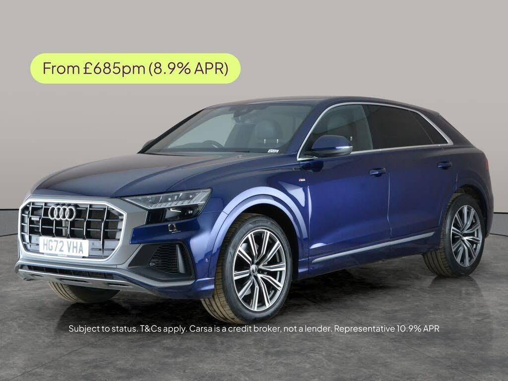 Experience luxury and performance with this stunning blue Audi Q8. Enjoy the immersive upgraded sound system, heated S line embossed leather sport seats, and the convenience of MMI Navigation Plus with Apple CarPlay. Advanced features like adjustable suspension, driver memory seat, and lane departure warning enhance every journey. LED headlights ensure clear visibility, while the reversing camera and B pillar ventilation offer extra comfort and confidence. This sporty SUV combines elegance and practicality in every drive. 2 services recorded, last serviced on 06/04/2026 at 25,229 miles. MOT to 30/01/2027. Visit our website for service history, online valuation, full vehicle specification plus multiple images. Certain features listed may be available via subscription packages at extra costs, please consult with Audi for details. This vehicle is VAT qualifying. Any feature/option specified here is from 3rd party data. We cannot guarantee the accuracy of any specification supplied by a 3rd party. We recommend that you physically check the specification of the vehicle on site prior to purchase. This information does not form part of the buying contract. Terms & Conditions apply. We have over 2,000 cars available from our 10 national branches, check our website to see all our stock. Our Trustpilot rating is 4.4/5 with over 9,000 reviews.