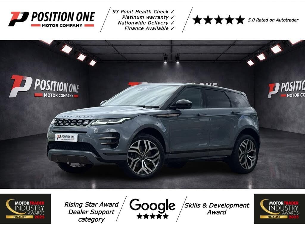 White interior.At Position One Motor Company, all vehicles go through an extensive health check with a main dealer or specialist, finance available, and extended platinum warranties available. We are pleased to offer this 2020 Range Rover Evoque 2.0 D180 MHEV First Edition, finished in grey with just 34,470 miles. This is a high specification First Edition model that combines luxury, advanced technology and everyday usability, making it one of the most desirable variants in the Evoque range. Powered by a 2.0 litre diesel engine producing 180 ps, paired with a smooth automatic gearbox and intelligent four wheel drive system, this Evoque delivers refined, effortless performance in all driving conditions. The mild hybrid system enhances efficiency and drivability, making it equally suited to long motorway journeys as it is to town driving. The First Edition specification offers an excellent level of equipment, including a fixed panoramic glass roof which floods the cabin with natural light, 20 inch alloy wheels that enhance the vehicles presence, and Matrix LED headlights which provide outstanding visibility. The Meridian sound system delivers a premium audio experience, while the Touch Pro Duo infotainment system provides a modern, intuitive interface for navigation, media and vehicle settings. Further features include a 360 degree surround camera system for easy manoeuvring, ClearSight rear view mirror technology for improved rear visibility, heated front seats and a heated steering wheel for added comfort, as well as Apple CarPlay and Android Auto connectivity. Navigation Pro, keyless entry and a powered tailgate further enhance convenience and usability. This example also benefits from Configurable Dynamics, allowing you to tailor throttle response, steering and driving characteristics, along with Adaptive Dynamics which continuously adjusts the suspension to provide an ideal balance between comfort and control. The interior is finished in Cloud and Ebony grained leather, creating a clean and contemporary feel, with high quality materials throughout that reflect the premium nature of the vehicle. A well presented, low mileage example that drives exactly as it should and offers excellent value for a high specification premium SUV. Nationwide delivery available.