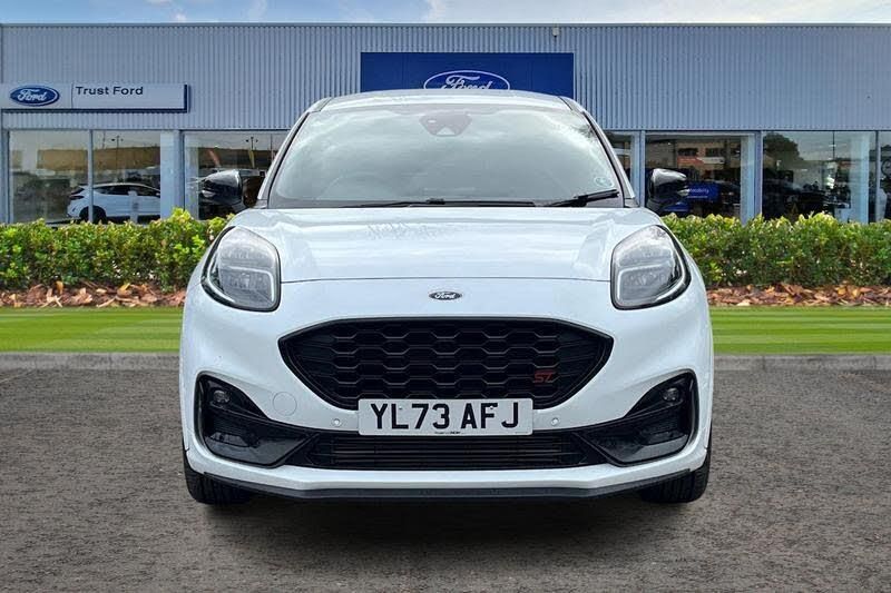 Cruise control with Intelligent speed assist, Driver impairment monitor, Emergency call service, Ford easy fuel, Front and rear parking sensors, Full digital 12.3 instrument cluster, Lane keeping aid with lane departure warning, Power assist steering, Selectable drive modes (normal, sport, eco, track), Speed sign recognition, Automatic headlights with auto high beam, Automatic rain sensing wipers, Dual chrome exhaust, Fixed LED signature headlamps, Front fog lamps, LED daytime running lights, LED rear lamps, Power foldable heated door mirrors with puddle lamps and puma logo protection, Privacy glass to side rear windows and tailgate glass, Quickclear heated windscreen, Rear side wing doors, Rear wiper, ST scuff plates, Third brake light, Unique ST body styling kit including wing mirrors and Ford Performance embossed splitter, 3 seat bench in 2nd row, Alloy sports pedals, Centre console with armrest and stowage, Ford megabox extended bootspace, Ford Performance sensico partial premium leather upholstery with metal grey stitching, Front and rear floor mats, Front and rear head restraints, Manual 6 way driver seat adjust with lumbar adjustment, Manual 6 way passenger seat with lumbar seat adjustment, Single front passenger seat, ST flat bottomed steering wheel with metal grey stitching, ST logo projection, Unique ST gear shift knob, Wireless charging pad with electronic air temperature control (EATC), 3 rear seatbelts, Child safety lock, Electronic stability control (ESC) and hill start assist, Pedestrian/cyclist detection & post-collision braking, Pre collision assist system, Red brake calipers, Tyre pressure monitoring system (TPMS)